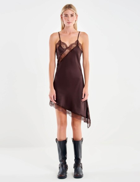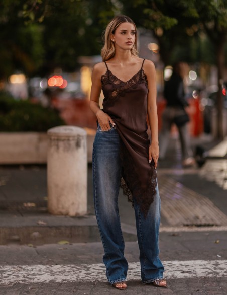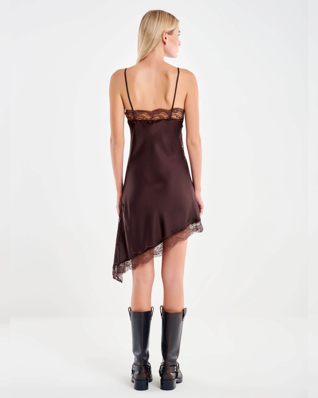 Elegante abito in seta con pregiati inserti in pizzo lungo i bordi e nella scollatura. Il taglio asimmetrico e la silhouette fluida creano un raffinato effetto cascante, mentre le sottili spalline regolabili garantiscono una vestibilità personalizzata. Realizzata in seta di alta qualità con finiture in pizzo francese, questa sottoveste rappresenta il perfetto connubio tra comfort e sensualità per un capo da lingerie di lusso.