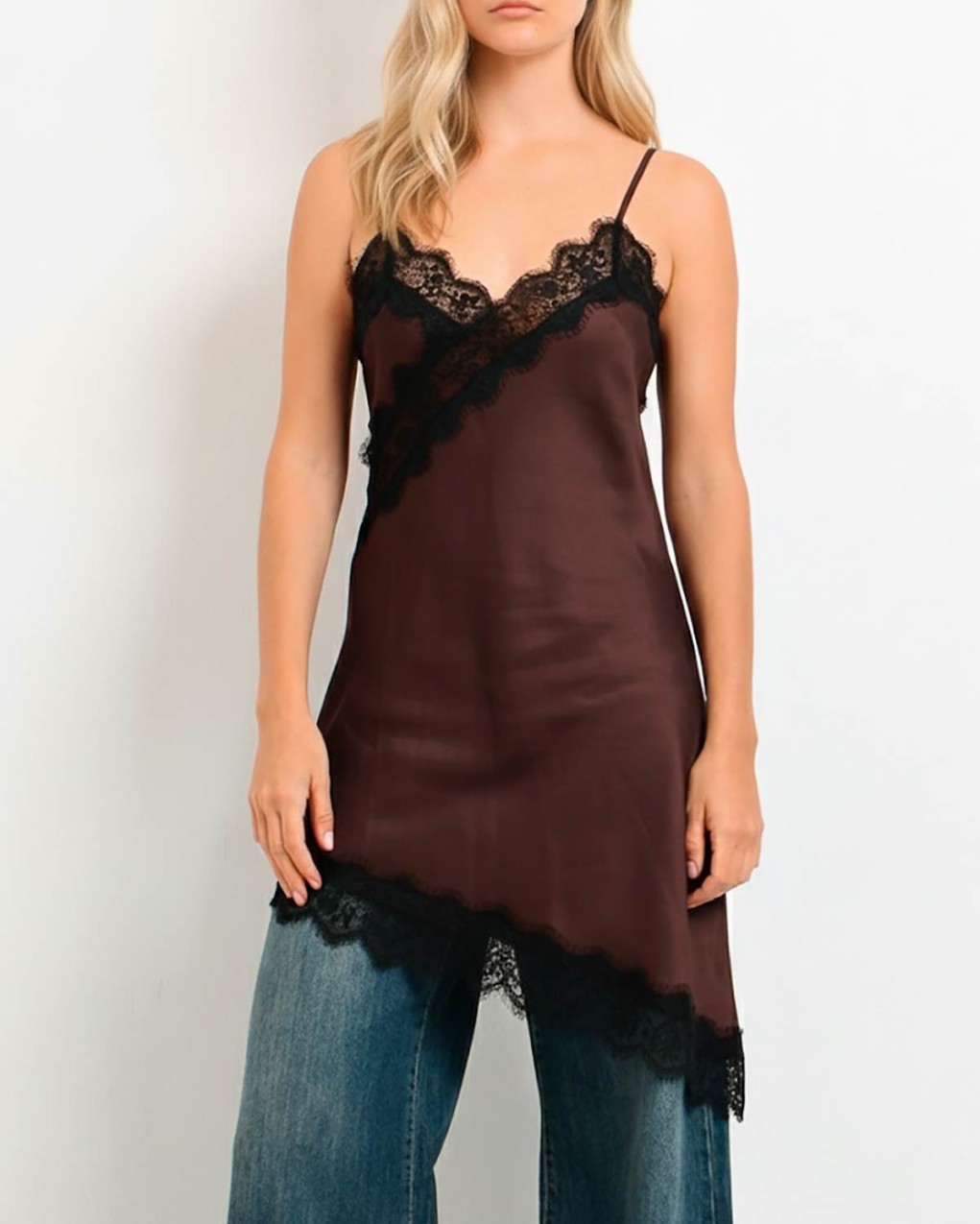 Elegante abito in seta con pregiati inserti in pizzo lungo i bordi e nella scollatura. Il taglio asimmetrico e la silhouette fluida creano un raffinato effetto cascante, mentre le sottili spalline regolabili garantiscono una vestibilità personalizzata. Realizzata in seta di alta qualità con finiture in pizzo francese, questa sottoveste rappresenta il perfetto connubio tra comfort e sensualità per un capo da lingerie di lusso.