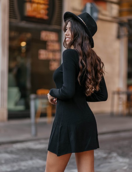 Abito in maglia a costine con silhouette svasata e linee pulite. La vestibilità aderente nella parte superiore si sviluppa in una gonna leggermente ampia, creando una forma femminile e sofisticata. Realizzato in morbido tessuto lavorato a maglia con maniche lunghe e girocollo, questo capo versatile si adatta perfettamente alle forme del corpo garantendo comfort e stile.