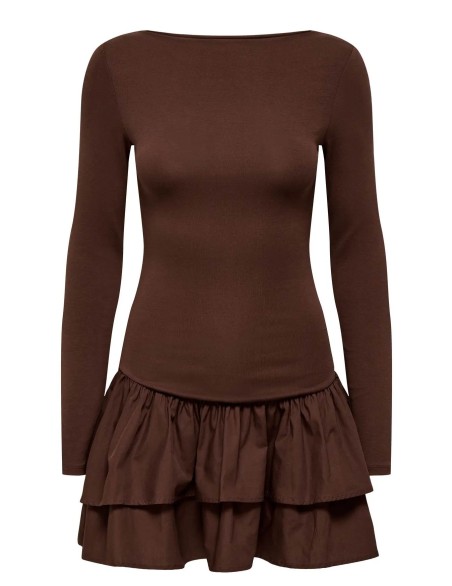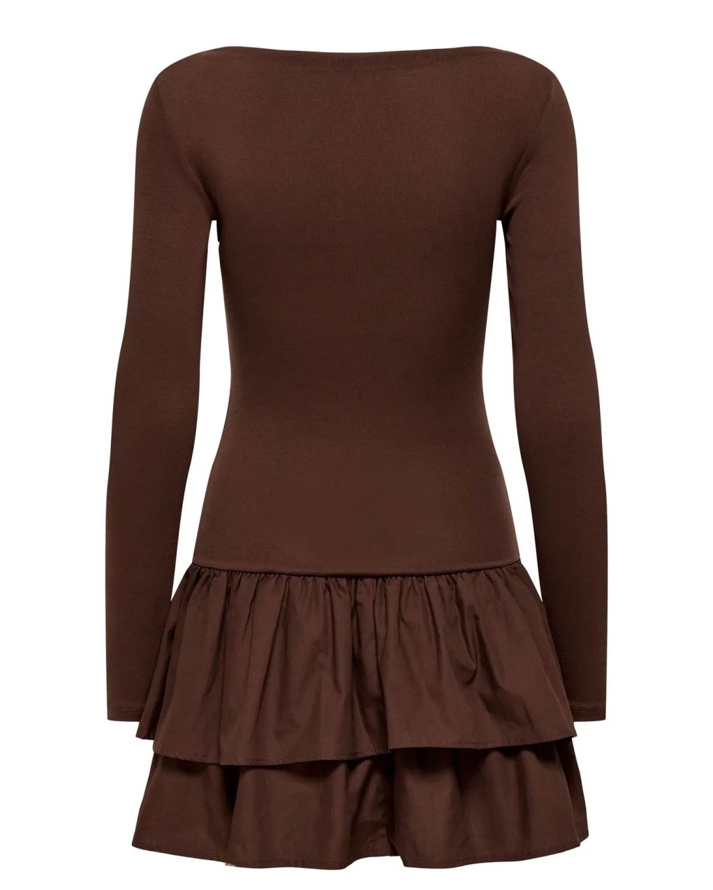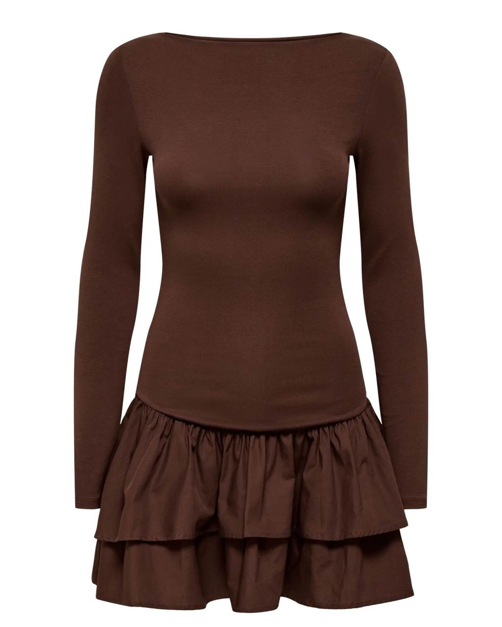 Elegante mini abito con design a due volumi: corpetto aderente a maniche lunghe e gonna a balze sovrapposte. Realizzato in morbido tessuto elasticizzato per la parte superiore e tessuto strutturato per la gonna, garantisce una vestibilità avvolgente che esalta la silhouette.