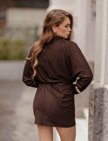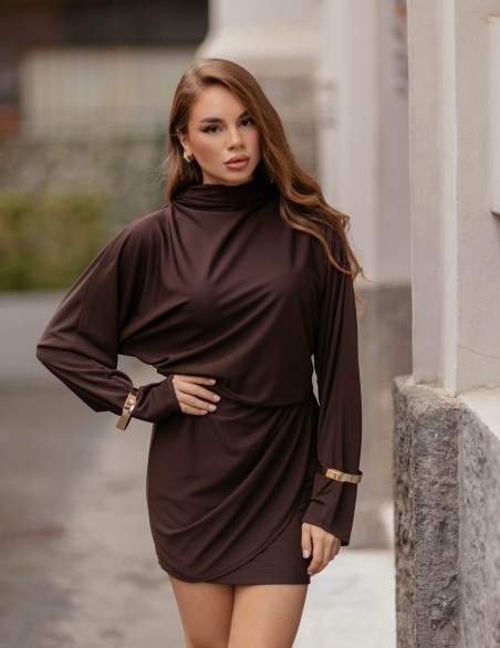 Mini abito elegante con collo alto e dettagli metallici sui polsini. Realizzato in morbido tessuto fluido che conferisce un raffinato drappeggio, presenta una silhouette oversize contemporanea. Le maniche lunghe e la linea essenziale rendono questo capo perfetto per occasioni sofisticate, garantendo comfort e stile.