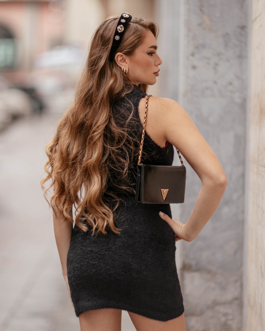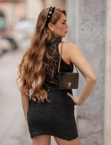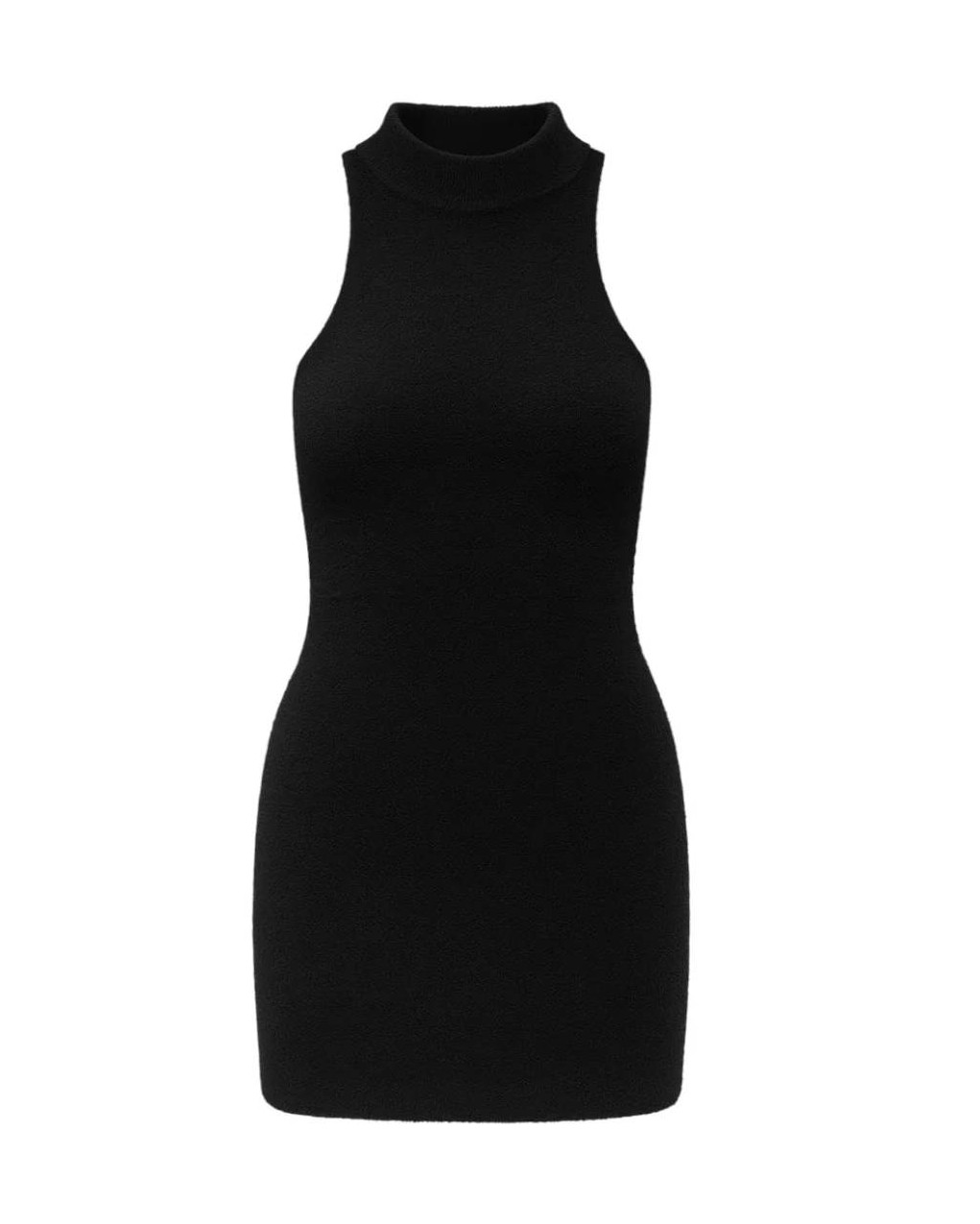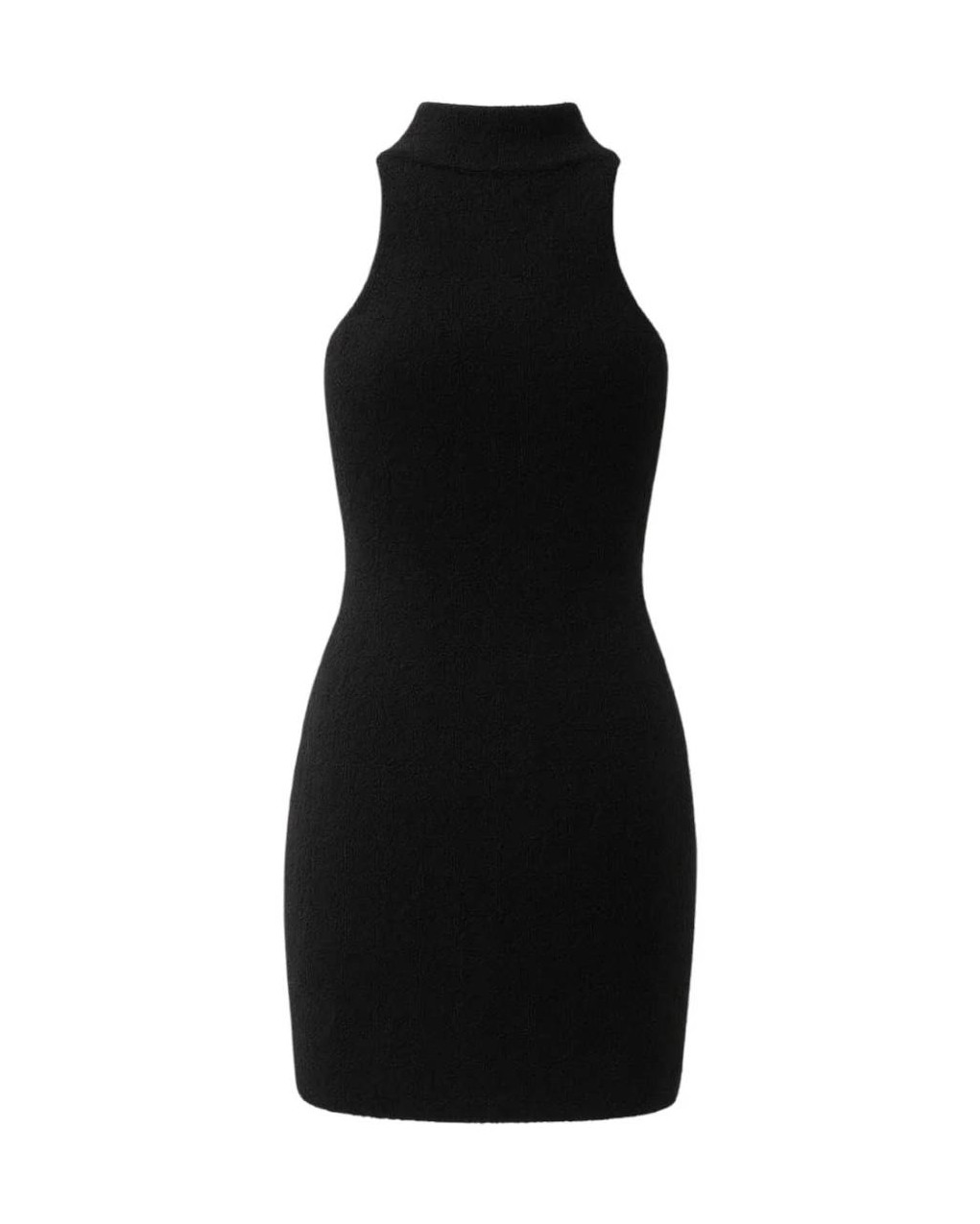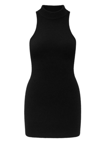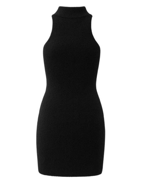 Elegante abito aderente in morbido tessuto lavorato a maglia con collo alto e design senza maniche. La silhouette attillata esalta le forme del corpo, mentre il materiale elasticizzato garantisce comfort e vestibilità perfetta. Un capo versatile che unisce stile minimal e raffinatezza, ideale per occasioni serali o look sofisticati.