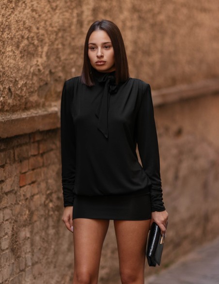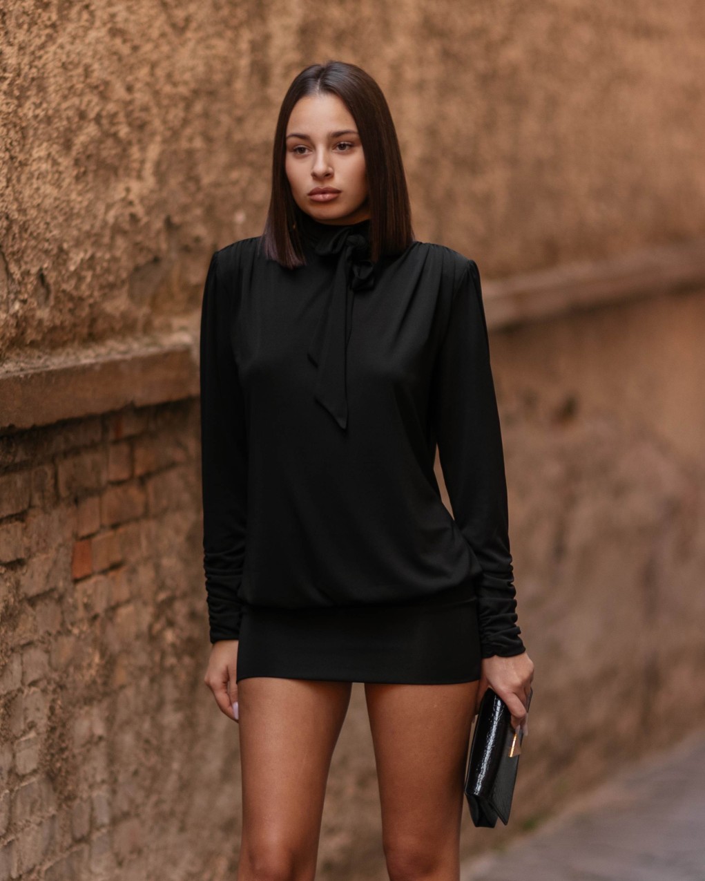 Abito corto elegante con silhouette aderente e design sofisticato, perfetto per occasioni serali e eventi speciali. Caratterizzato da maniche lunghe con dettaglio arricciato sui polsi, collo alto con fiocco decorativo e spalle strutturate che conferiscono un tocco contemporaneo. Realizzato in tessuto fluido di alta qualità che garantisce comfort e una vestibilità aderente che valorizza la figura. Il taglio mini e la linea pulita rendono questo capo un must-have versatile per un look raffinato e moderno.
