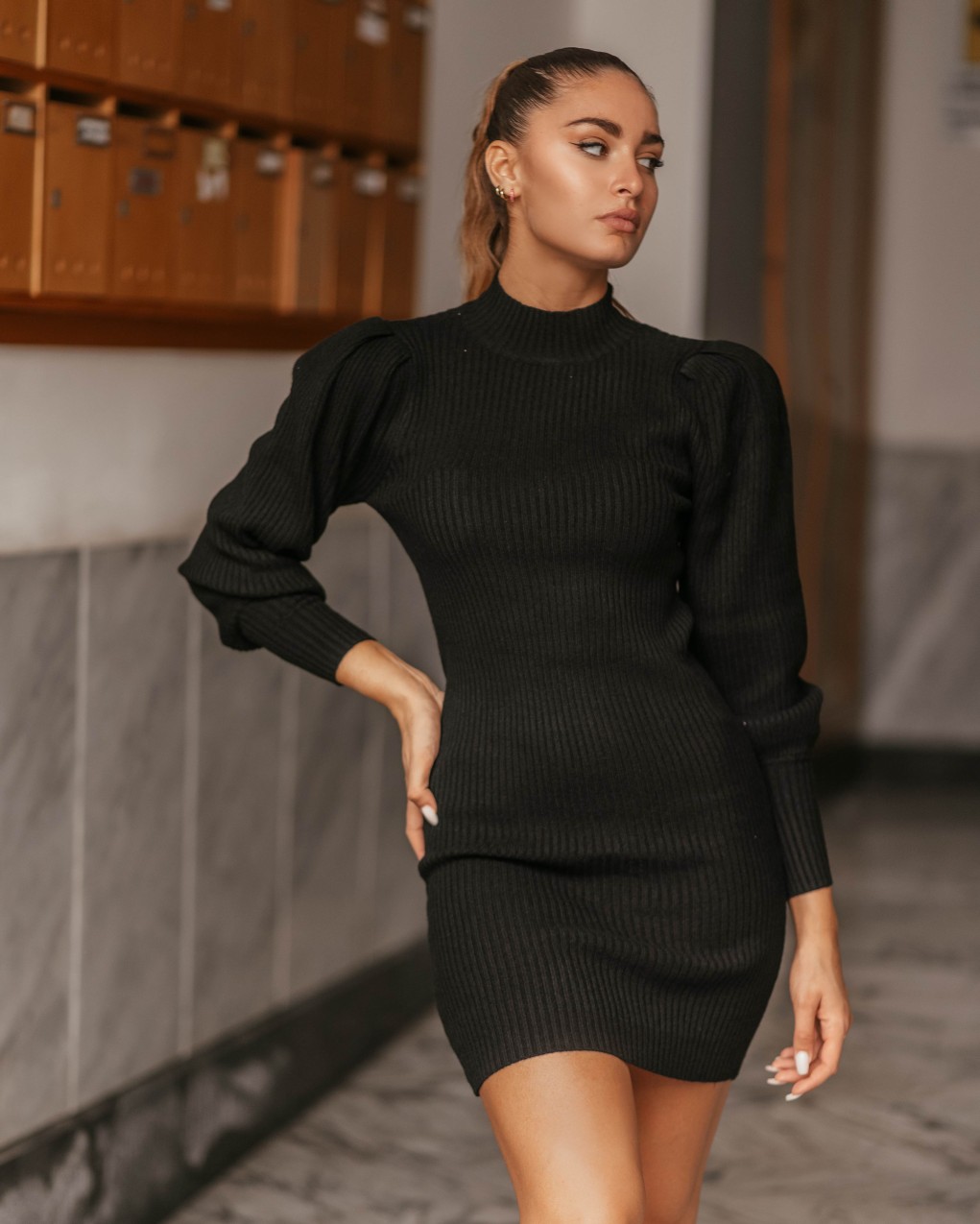 Abito in maglia corto dal design elegante e femminile, caratterizzato da maniche a sbuffo voluminose e collo alto. Realizzato in morbido tessuto a coste che offre comfort ed elasticità, questo capo presenta una silhouette aderente che valorizza la figura. La vestibilità è slim fit con lunghezza mini, perfetto per occasioni casual-chic o serate informali. Un essenziale versatile del guardaroba che unisce stile contemporaneo e praticità.