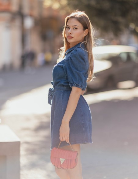 Abito chemisier in denim dallo stile casual-chic, perfetto per un look versatile e contemporaneo. Realizzato in tessuto denim di qualità, presenta maniche corte a palloncino, chiusura frontale con bottoni e cintura in vita removibile per definire la silhouette. Il design include un pratico colletto classico e vestibilità aderente che valorizza la figura femminile. Ideale per occasioni informali ed eleganti, garantisce comfort e stile in ogni momento della giornata.