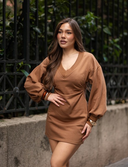 Abito corto in felpa con scollo a V profondo e design casual-elegante, perfetto per un look contemporaneo e versatile. Caratterizzato da maniche lunghe a palloncino con polsini a costine e silhouette aderente che valorizza la figura. Realizzato in tessuto morbido e confortevole, offre una vestibilità slim con lunghezza mini. Il dettaglio delle costine a contrasto sul collo e sui polsini aggiunge un tocco sportivo-chic al capo.
