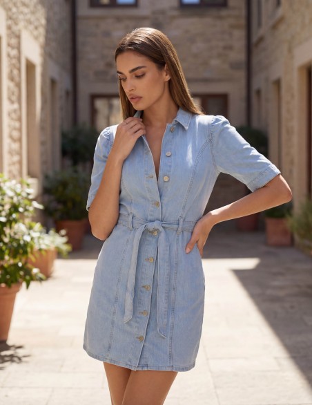 Abito chemisier in denim dallo stile casual-chic, perfetto per la stagione estiva. Realizzato in tessuto denim morbido e confortevole, presenta maniche corte, chiusura frontale con bottoni e pratica cintura in vita per definire la silhouette. La vestibilità è regolare con lunghezza mini, ideale da indossare sia in occasioni informali che per un look da giorno versatile e contemporaneo.