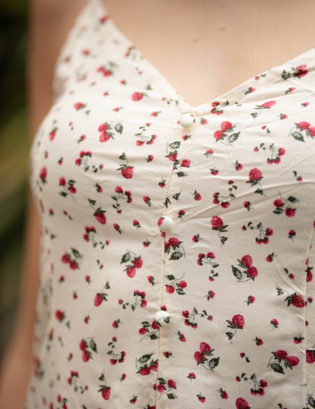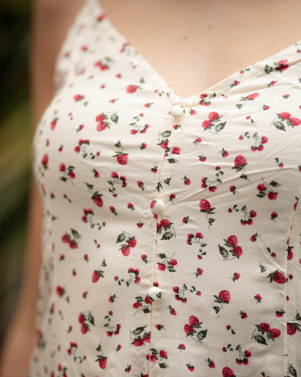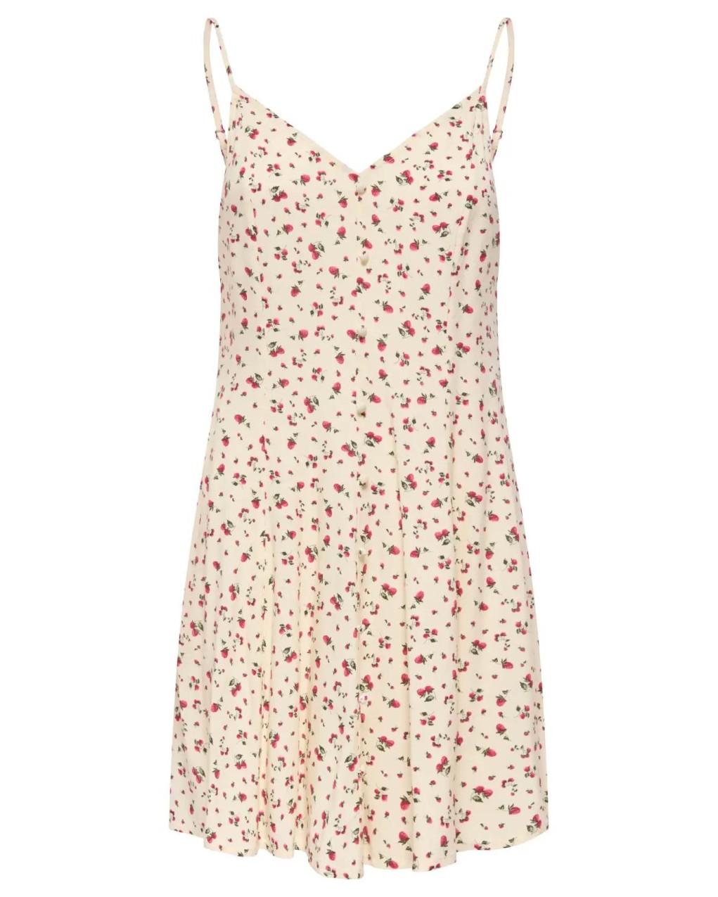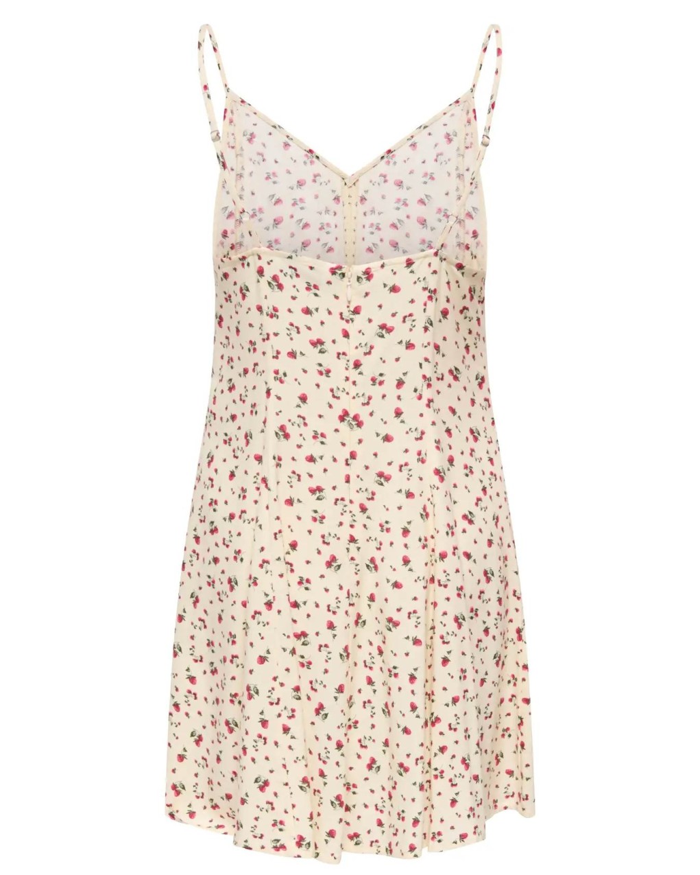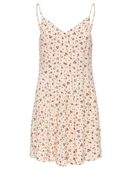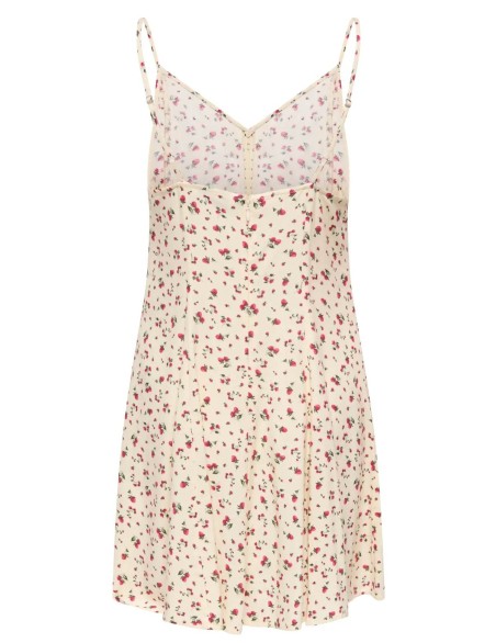 Mini abito femminile con spalline sottili, perfetto per la stagione estiva. Realizzato in tessuto leggero e fluido con delicata fantasia floreale, presenta una scollatura a V e dettagli di volant sul fondo per un tocco romantico. Il design slip dress offre una vestibilità comoda e morbida che valorizza la silhouette. Ideale per outfit casual-chic da giorno o da sera.