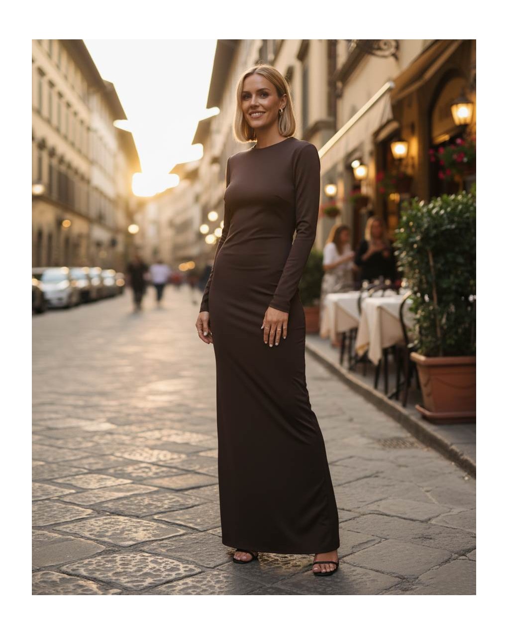 Elegante abito lungo da sera caratterizzato da una silhouette aderente che esalta le forme. Il design minimalista presenta maniche lunghe e girocollo, realizzato in morbido tessuto elasticizzato per garantire comfort e vestibilità impeccabile. La linea sartoriale pulita ed essenziale rende questo capo perfetto per eventi formali e occasioni speciali.