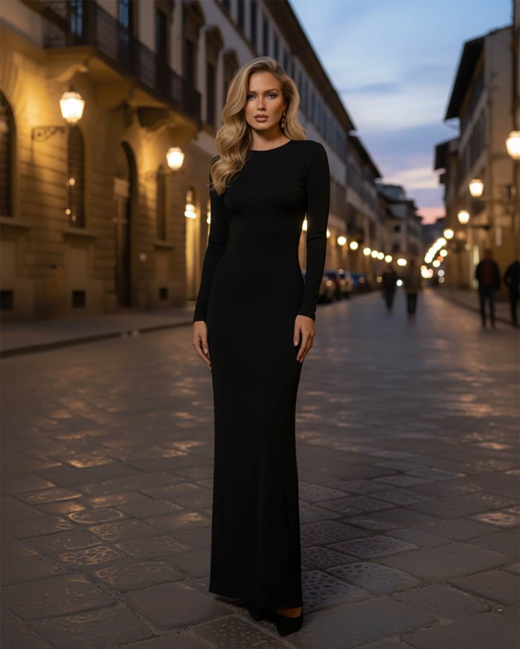 Elegante abito lungo da sera caratterizzato da una silhouette aderente che esalta le forme. Il design minimalista presenta maniche lunghe e girocollo, realizzato in morbido tessuto elasticizzato per garantire comfort e vestibilità impeccabile. La linea sartoriale pulita ed essenziale rende questo capo perfetto per eventi formali e occasioni speciali.