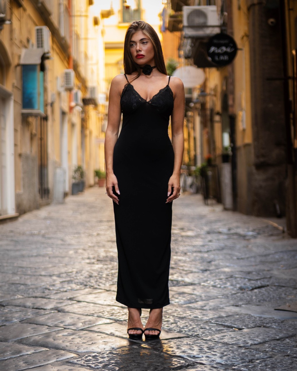 Elegante abito lungo da sera con silhouette aderente e taglio minimalista. Realizzato in morbido tessuto elasticizzato che segue le forme del corpo, presenta spalline sottili regolabili e una scollatura sulla schiena che aggiunge un tocco di sensualità. La vestibilità slim e la lunghezza maxi lo rendono perfetto per occasioni formali e serate speciali.