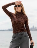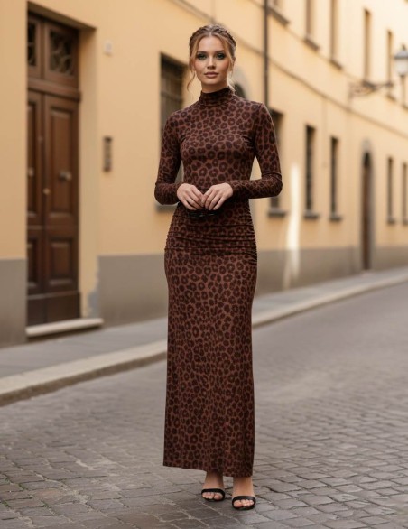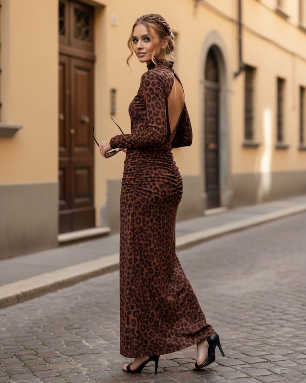 Elegante abito lungo con stampa animalier, caratterizzato da un sensuale taglio sulla schiena e maniche lunghe. Il design presenta arricciature strategiche che esaltano la silhouette, mentre il collo alto aggiunge un tocco di raffinatezza. La vestibilità aderente e il tessuto morbido garantiscono comfort e stile, rendendolo perfetto per occasioni speciali.