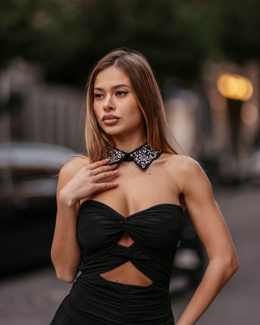 Abito lungo da sera in stile contemporaneo con design sofisticato e sensuale. Caratterizzato da corpetto bustier con drappeggio incrociato e cut-out strategici sulla zona addominale. Realizzato in tessuto elasticizzato che segue le curve del corpo, garantisce una vestibilità aderente e sagomata. La silhouette longuette con linea a sirena è ideale per eventi serali ed occasioni speciali.