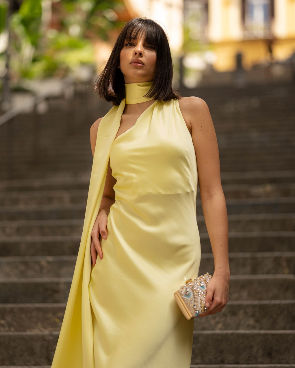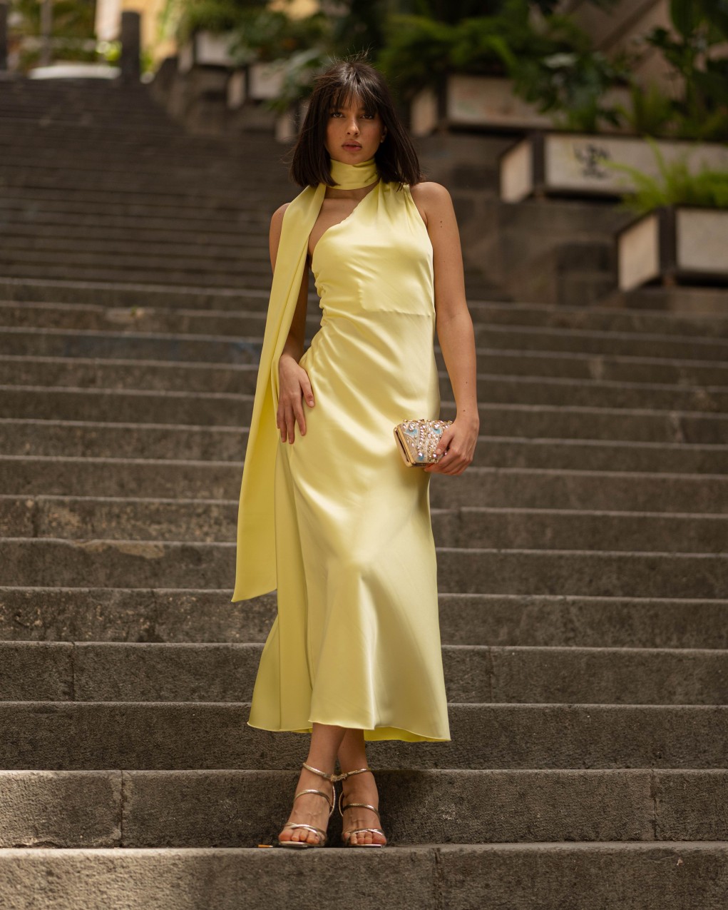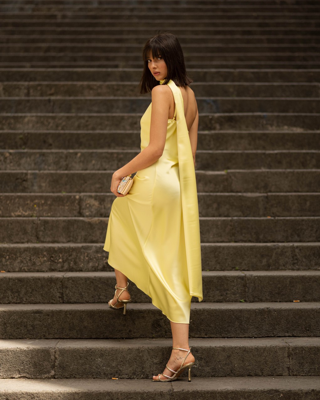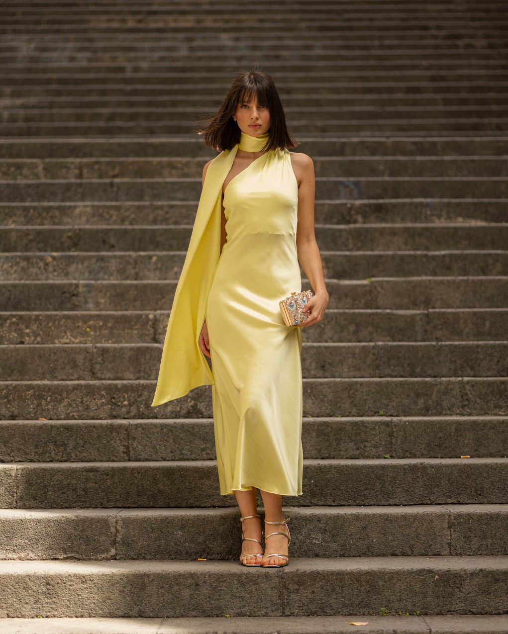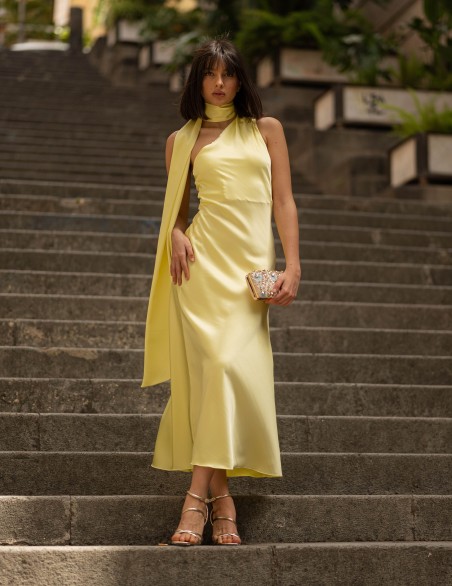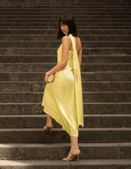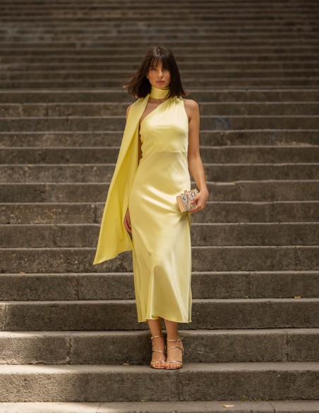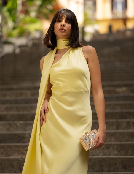 Abito lungo da sera in elegante raso satinato, caratterizzato da un design asimmetrico con collo alto avvolgente e scollatura profonda sul davanti. Il tessuto fluido e luminoso crea una silhouette sofisticata che valorizza la figura, mentre la lunghezza midi e la vestibilità aderente garantiscono un look raffinato. Ideale per eventi formali e occasioni speciali, questo capo presenta dettagli sartoriali ricercati con drappeggio laterale che aggiunge movimento ed eleganza.
