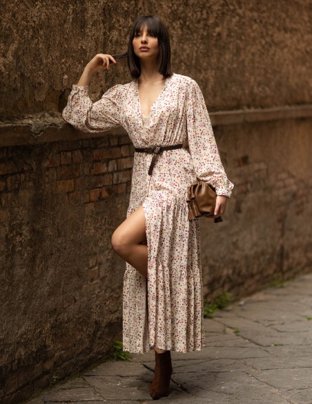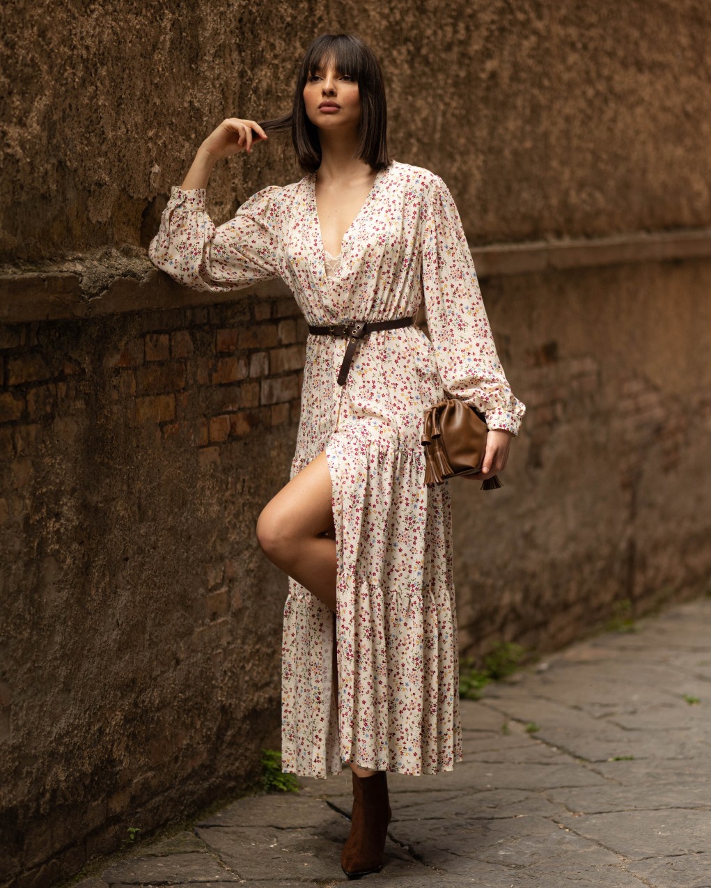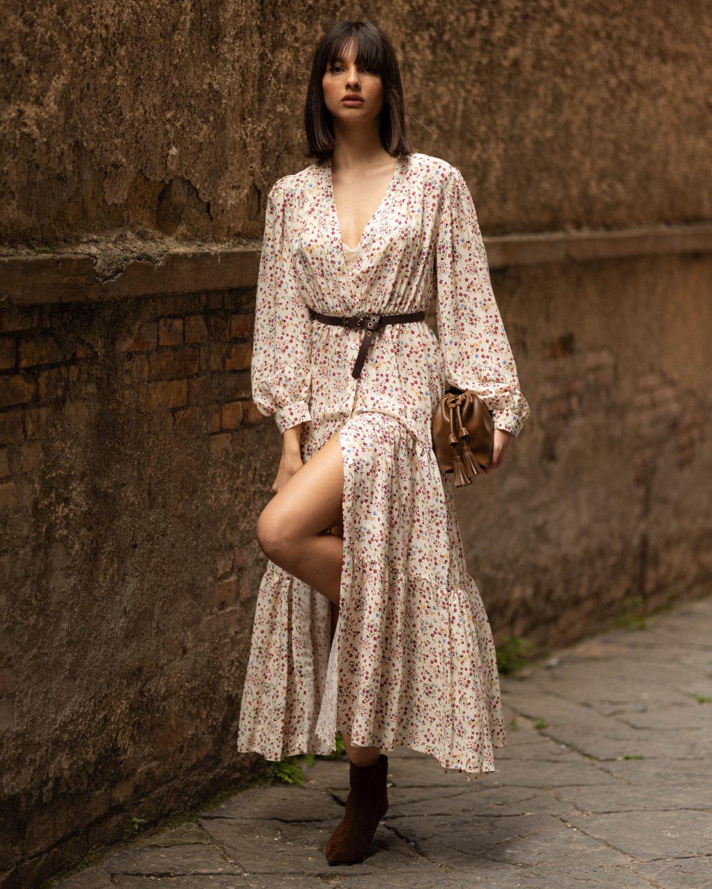Abito lungo femminile in stile romantico con delicata stampa floreale su tessuto leggero e fluido. Presenta scollo a V profondo, maniche lunghe a palloncino con polsini elasticizzati e gonna a balze stratificate per un effetto vaporoso. Realizzato in tessuto morbido e traspirante, perfetto per la mezza stagione. La vestibilità è regolare con cintura in vita che enfatizza la silhouette, ideale per occasioni eleganti e casual chic.