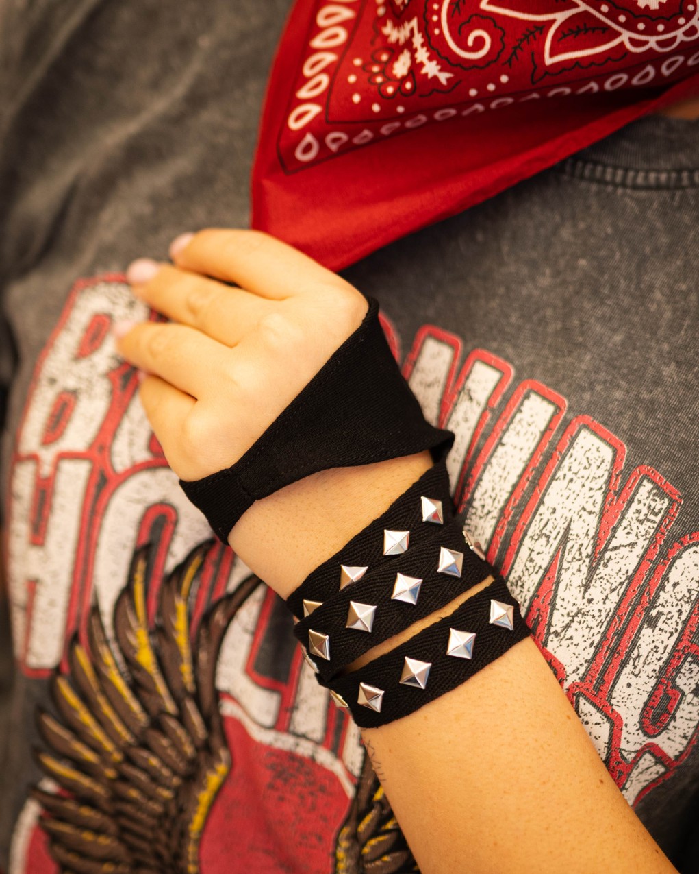 Guanto avvolgente in tessuto elastico con borchie piramidali metalliche, perfetto per un look rock e alternativo. Il design multi-fascia permette una vestibilità regolabile e confortevole, mentre le decorazioni metalliche aggiungono un tocco audace e ribelle. Realizzato in resistente nastro elastico di alta qualità, si adatta perfettamente al polso garantendo stile e praticità.