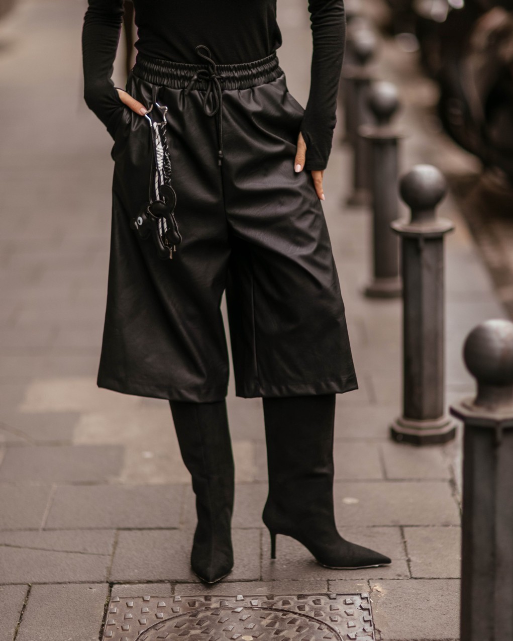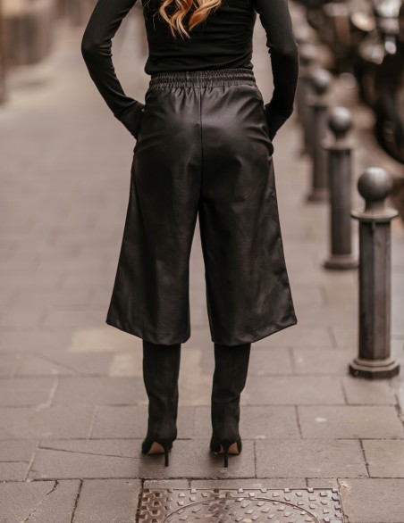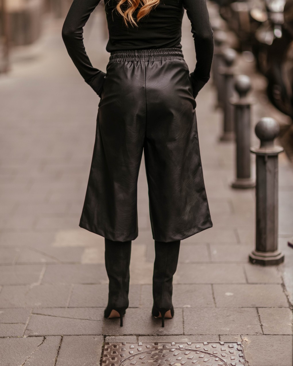 Pantaloncini bermuda in ecopelle dallo stile urban contemporaneo, perfetti per un look sofisticato e grintoso. Realizzati in materiale effetto pelle con finitura opaca, presentano vita elasticizzata con coulisse regolabile e comode tasche laterali. La vestibilità è comoda e rilassata, con lunghezza al ginocchio che garantisce un taglio moderno e versatile. Ideali per completare outfit casual-chic o streetwear di carattere.