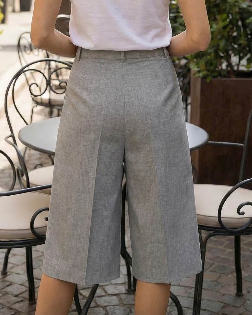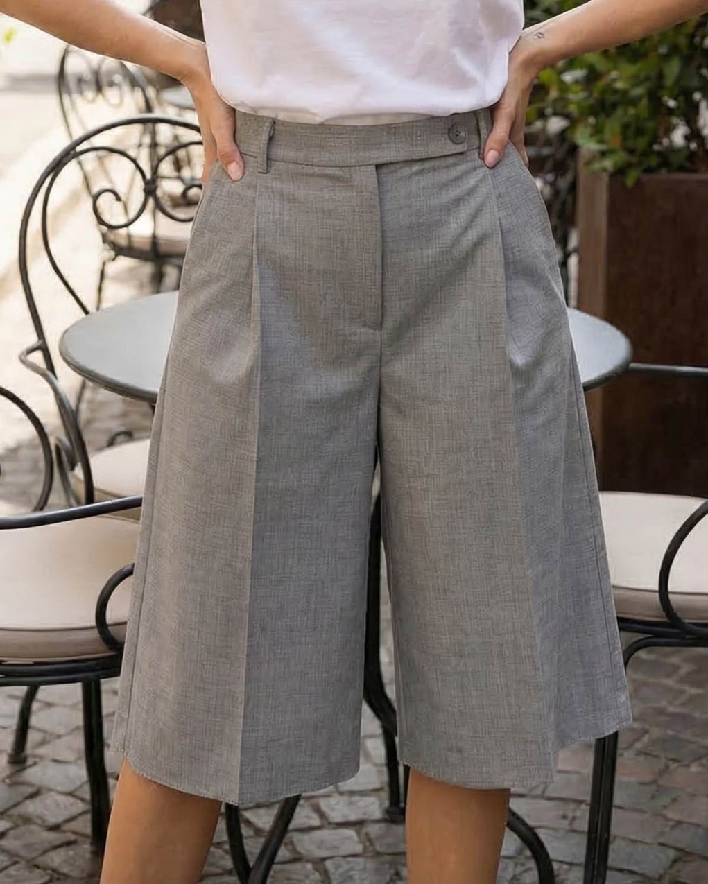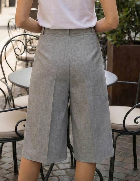 Bermuda dalla linea elegante e sofisticata, perfetto per outfit da ufficio o occasioni formali. Realizzato in tessuto di qualità con pieghe frontali ben definite, presenta vita alta con passanti per cintura e pratiche tasche laterali. La vestibilità è comoda e strutturata, con gamba ampia che termina sotto il ginocchio per una silhouette moderna e raffinata. Il design sartoriale lo rende un capo versatile, facilmente abbinabile per look professionali e casual-chic.