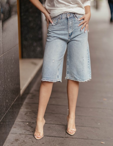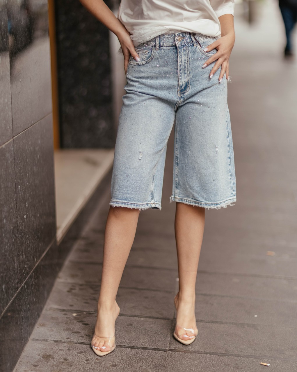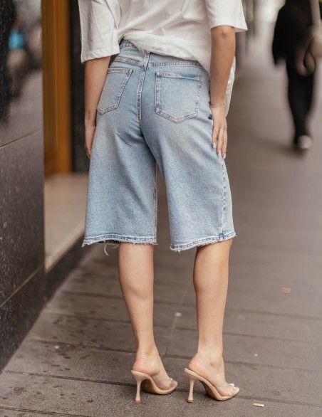 Bermuda in denim dal taglio ampio e lunghezza al ginocchio, caratterizzati da uno stile casual-contemporary con dettagli vissuti. Realizzati in tessuto denim di cotone con leggera texture, presentano orlo sfrangiato per un finish autentico e cinque tasche classiche. La vestibilità a vita alta garantisce comfort e una silhouette moderna, ideale per look everyday versatili. Il fit rilassato assicura libertà di movimento mantenendo una linea strutturata.