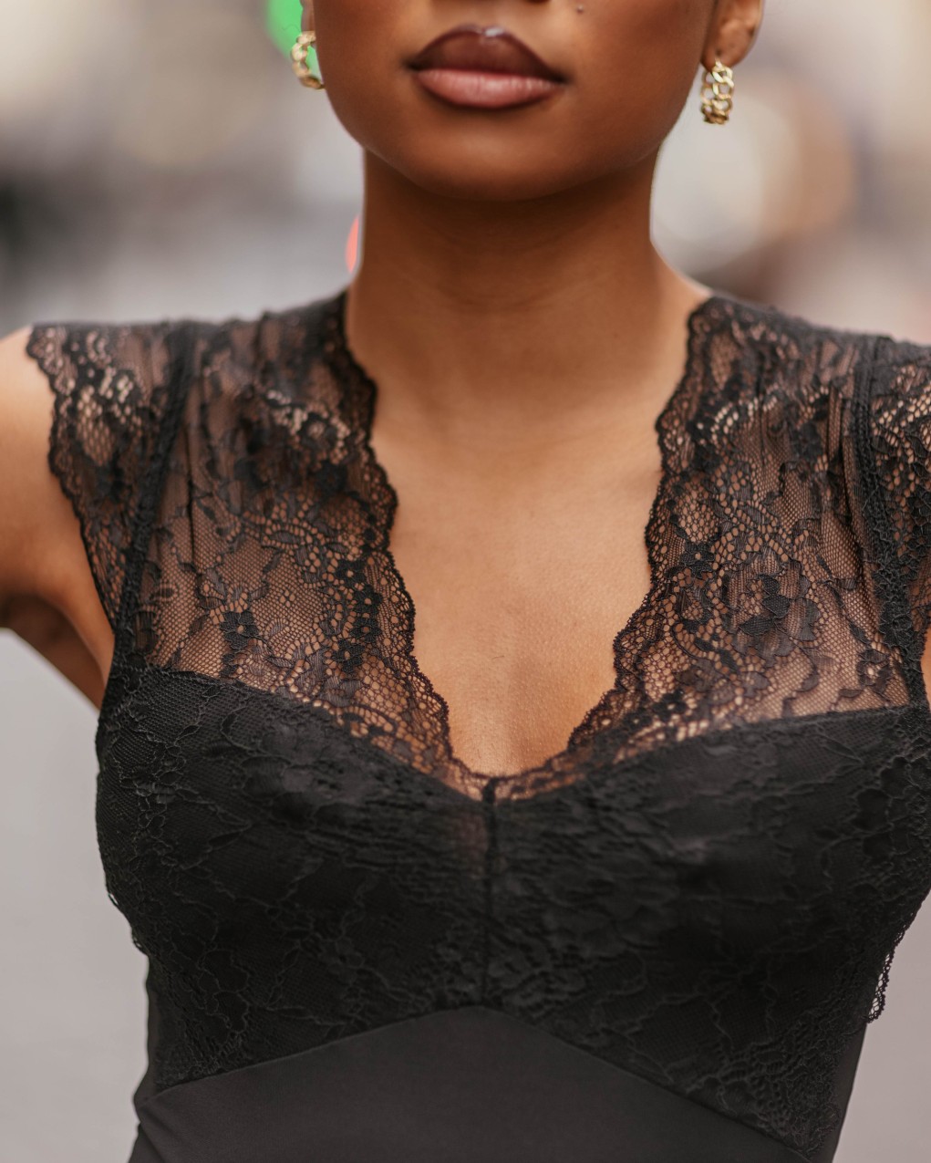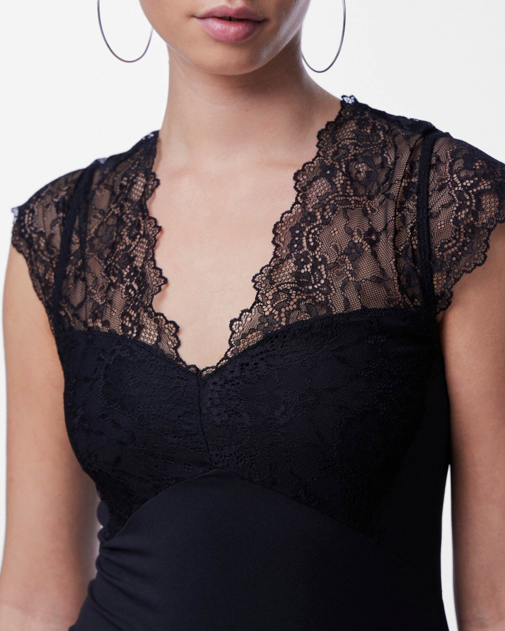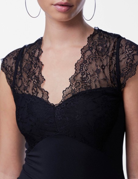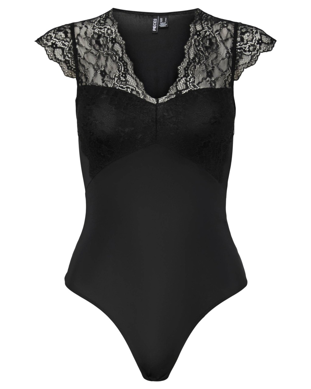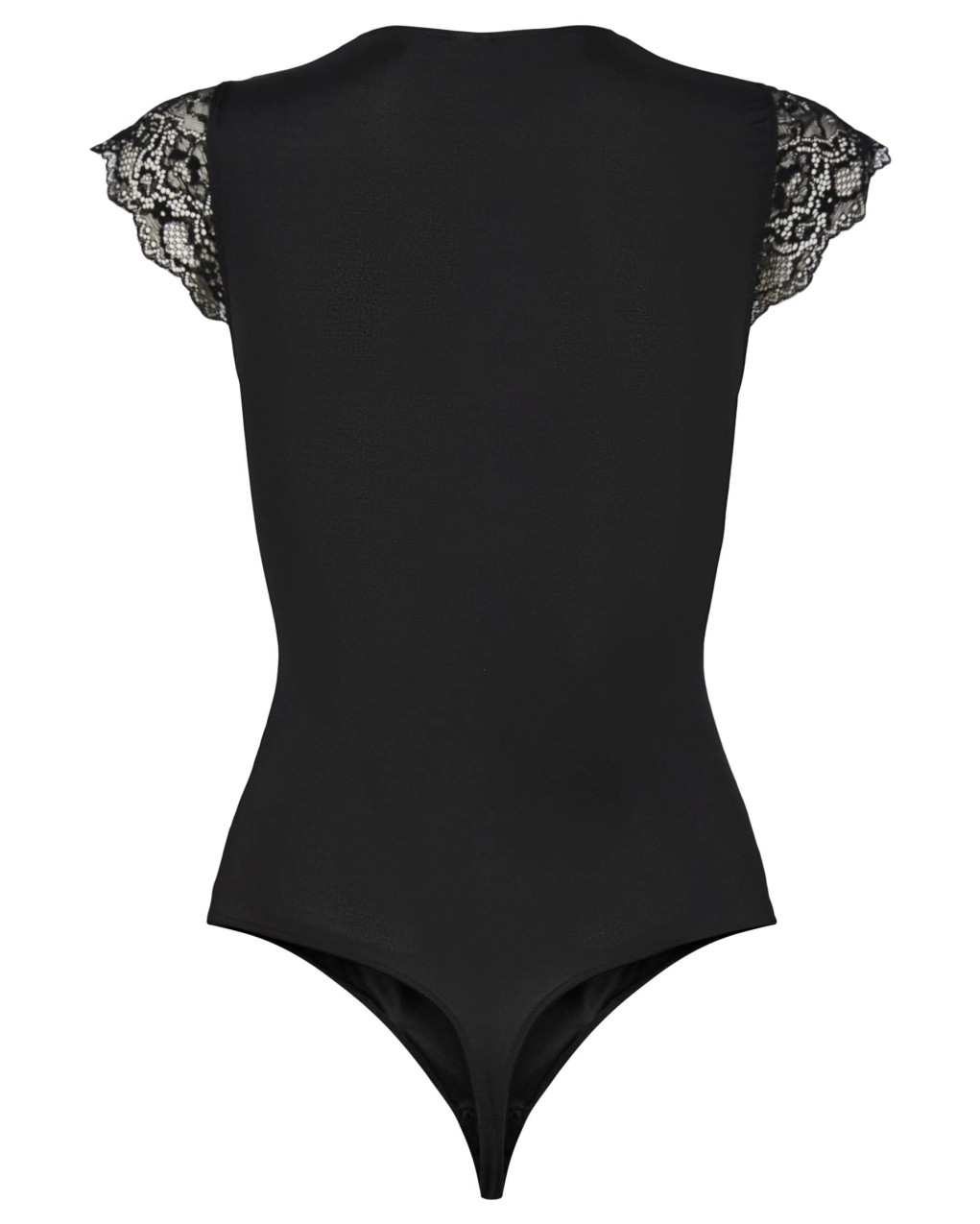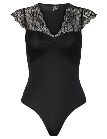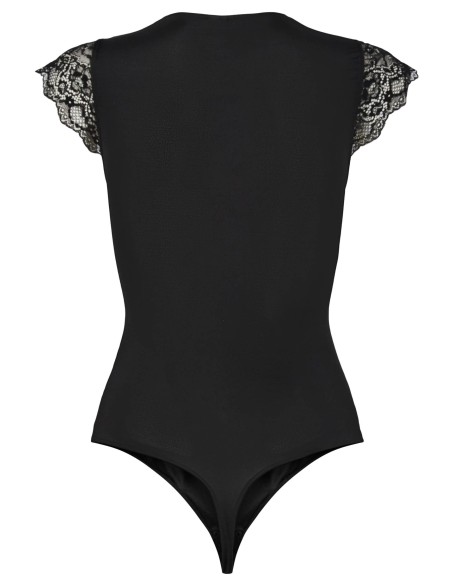 Il body presenta inserti in pizzo al seno e alle spalle, che conferiscono un effetto delicato e femminile.
