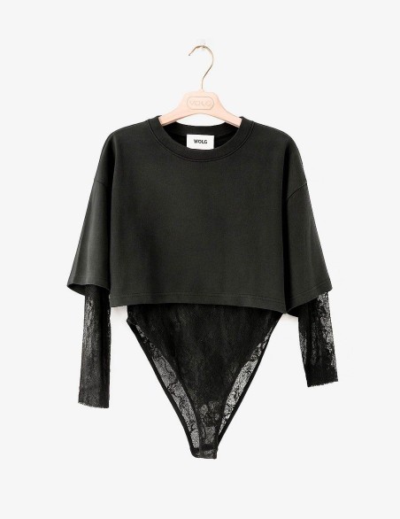 Body combinato t-shirt in cotone e maniche e busto in pizzo trasparente. Chiusura con bottoncini sul fondo. Dettaglio body sgambato.