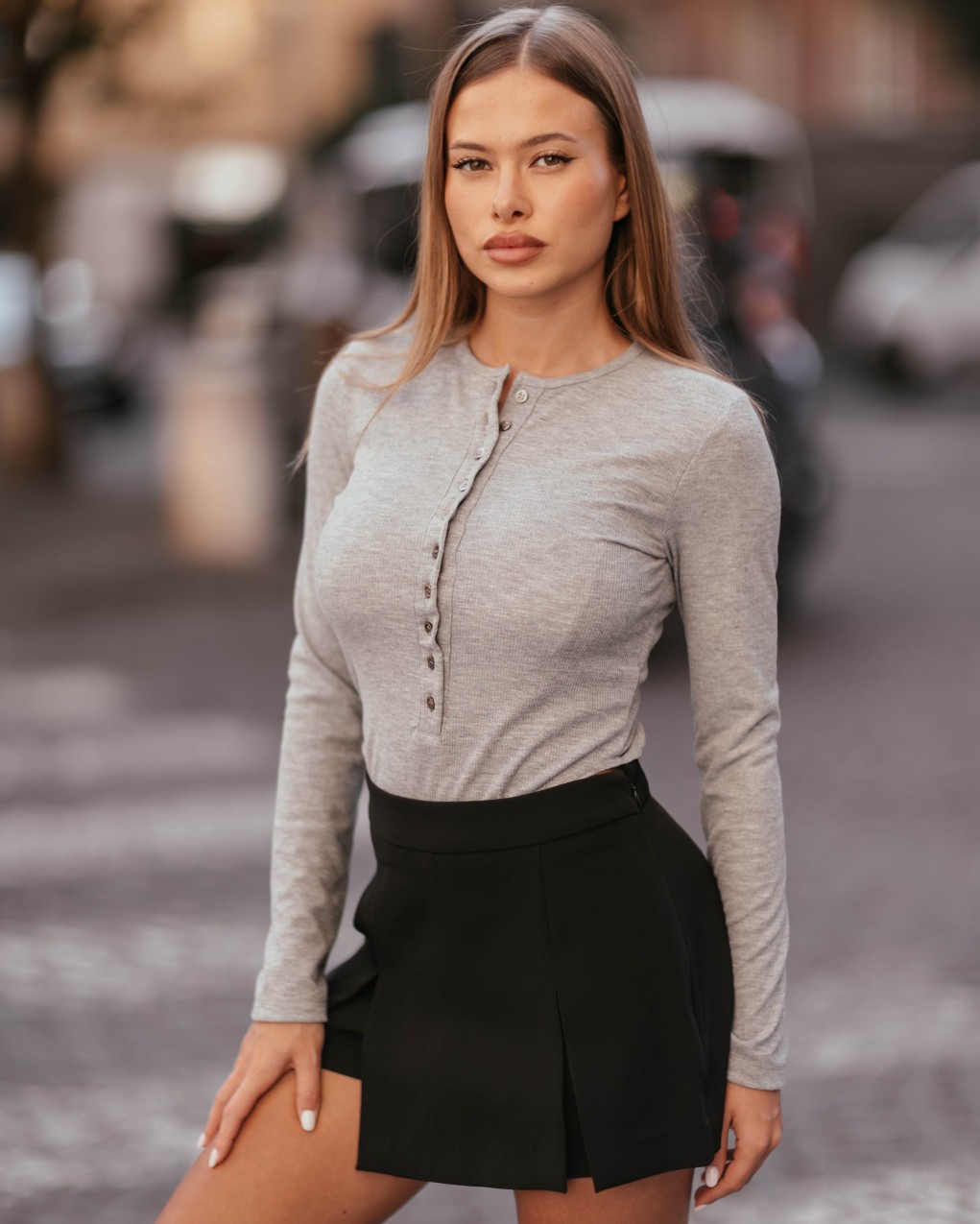 Body maniche lunghe sgambato a costine. Colletto con chiusura serafino con bottoncini. Chiusura sul fondo con bottoncini a pressione.