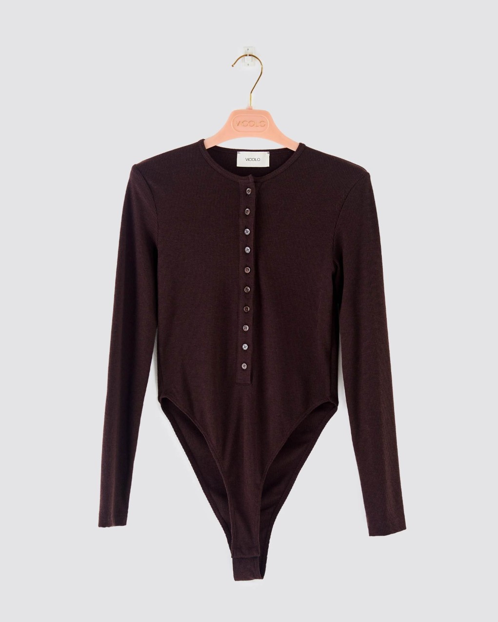 Body maniche lunghe sgambato a costine. Colletto con chiusura serafino con bottoncini. Chiusura sul fondo con bottoncini a pressione.