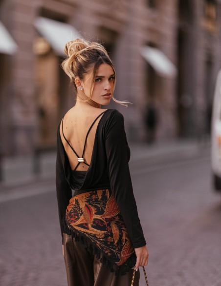 Elegante body a maniche lunghe con scollo a barca, realizzata in morbido jersey elasticizzato per una vestibilità aderente e confortevole. Il design presenta drappeggi laterali che creano un effetto arricciato sul fianco. Silhouette femminile e raffinata, perfetta per outfit sia casual che più ricercati.