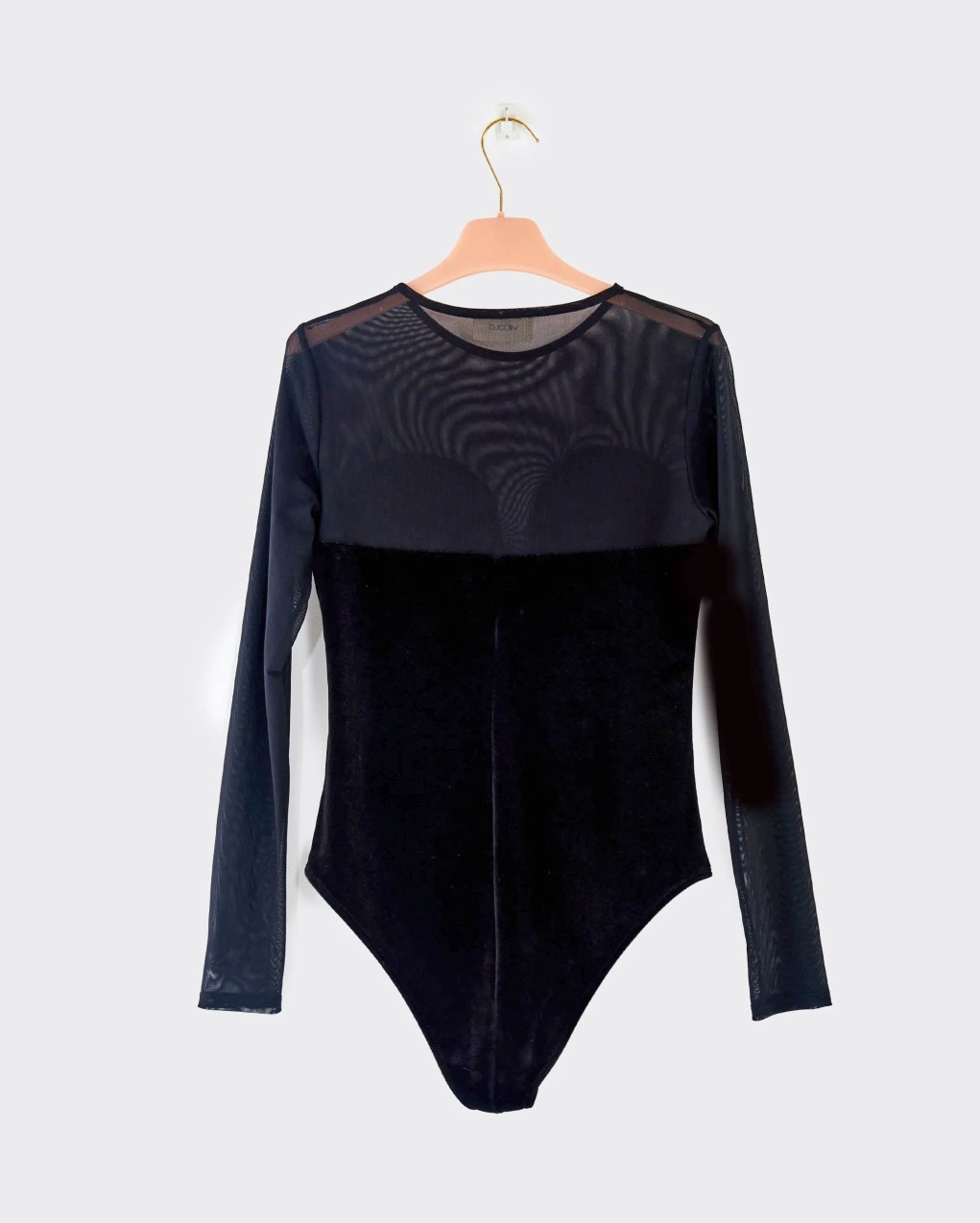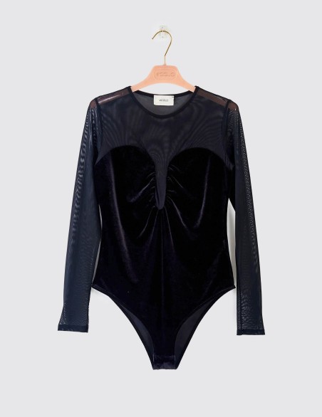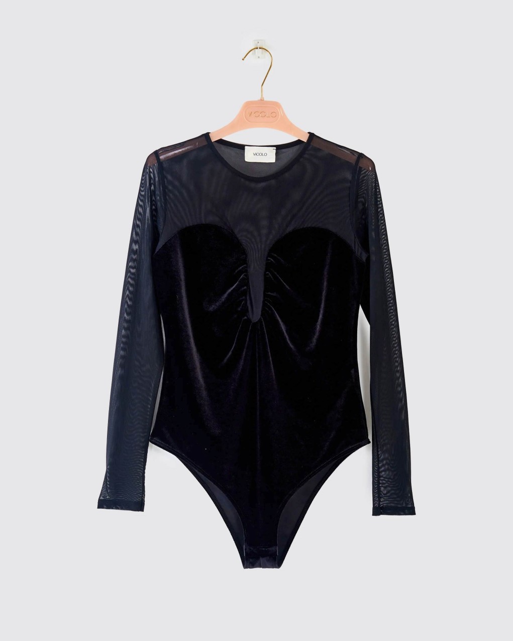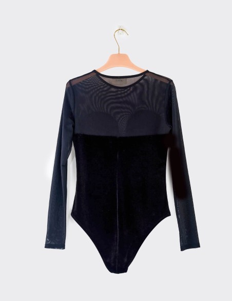 Body in tulle maniche lunghe girocollo. Con doppio tessuto effetto top scollo a cuore con arriccio in ciniglia. Chiusura sul fondo con gancetti.