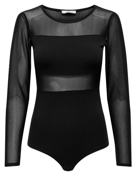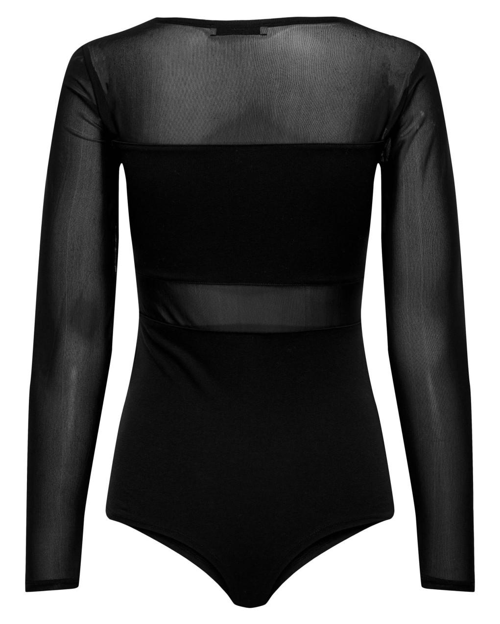 Body elegante in tessuto elasticizzato con inserti in mesh trasparente. Design raffinato caratterizzato da maniche lunghe e dettagli see-through sulla parte superiore e sulla schiena. La vestibilità aderente modella la silhouette, mentre il tessuto stretch garantisce massimo comfort e libertà di movimento.