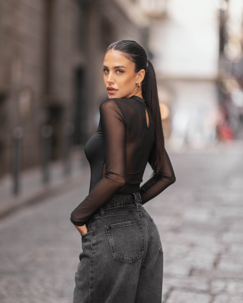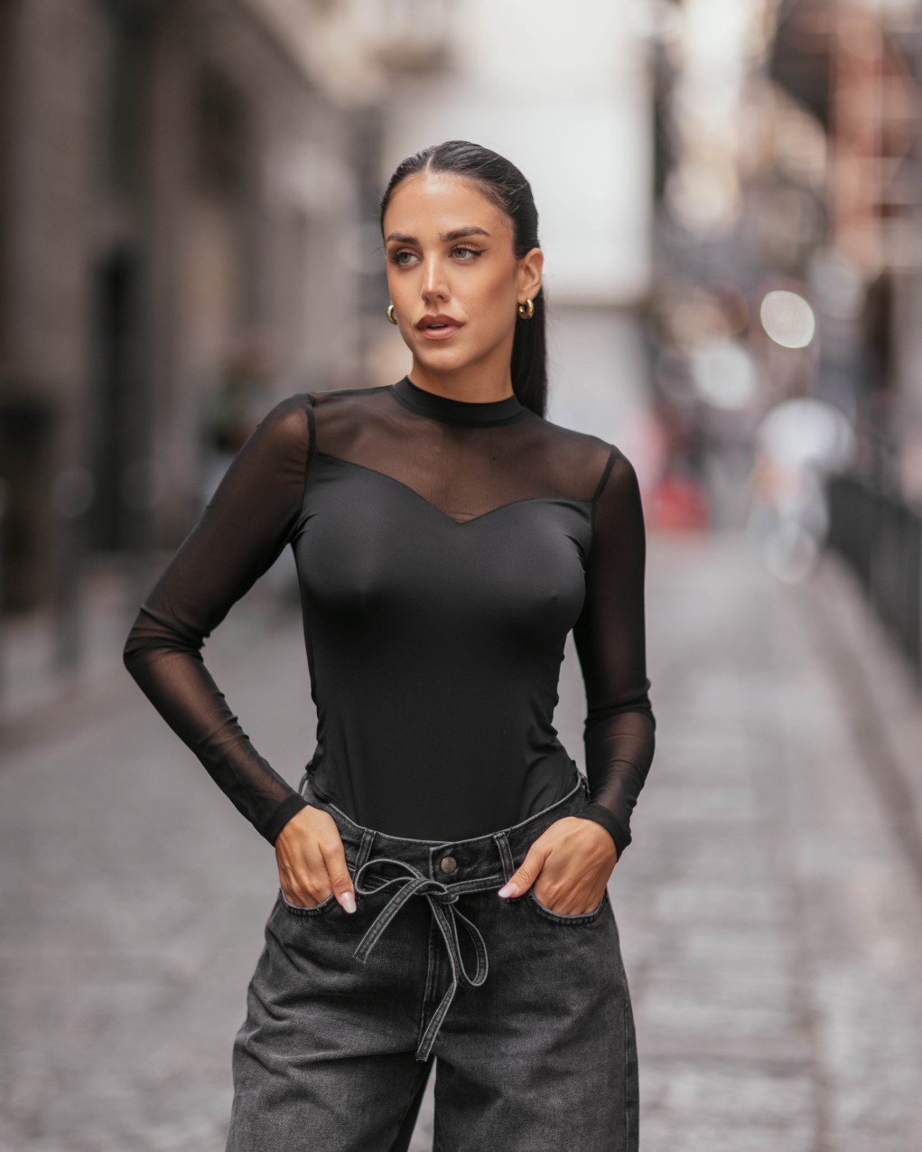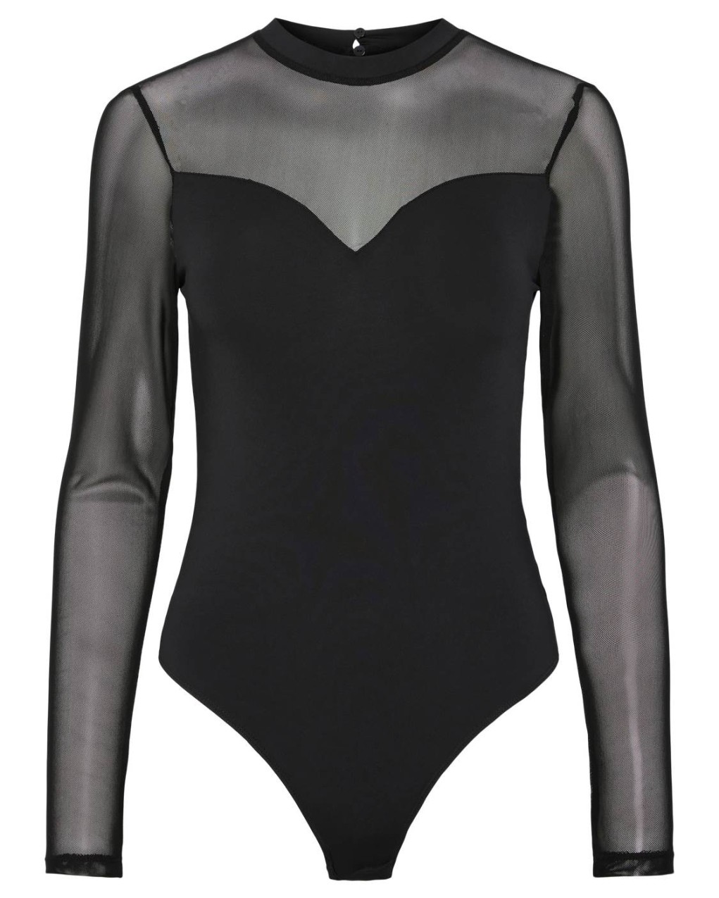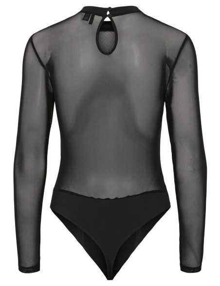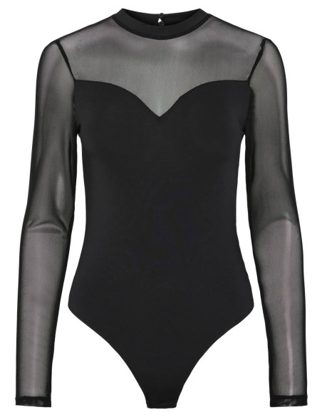 Body elegante con maniche lunghe in tulle Body femminile dal design sofisticato con maniche lunghe in tulle trasparente e girocollo. Il corpino strutturato presenta una scollatura a cuore che valorizza la silhouette, mentre gli inserti in tessuto velato sulle spalle e sulle braccia creano un effetto sensuale ed elegante. Realizzato in materiale elasticizzato di qualità per garantire comfort e vestibilità aderente. Perfetto per occasioni speciali e serate eleganti, si abbina idealmente a gonne di ogni lunghezza o pantaloni a vita alta.
