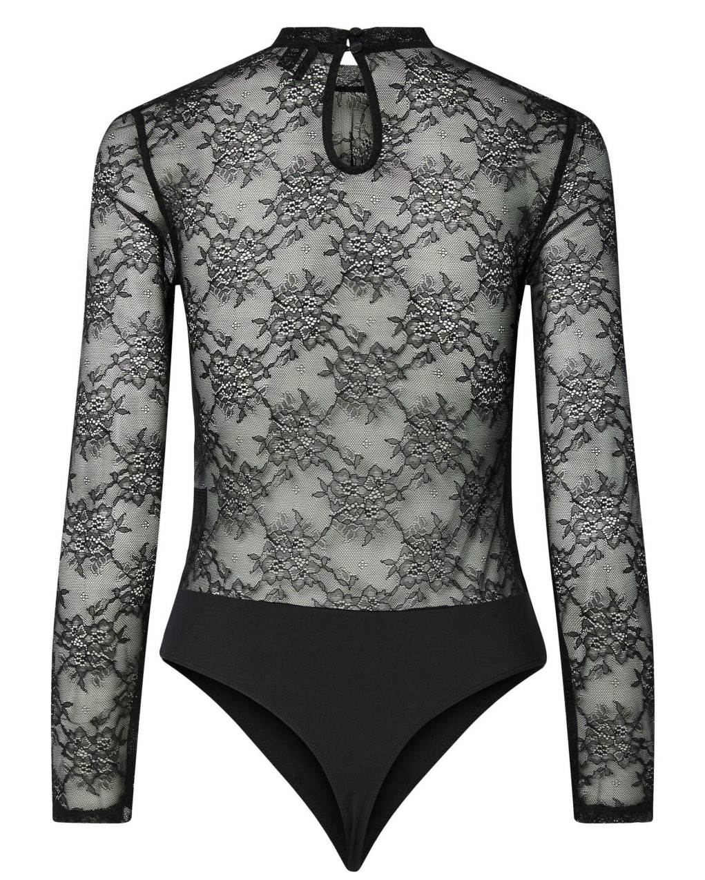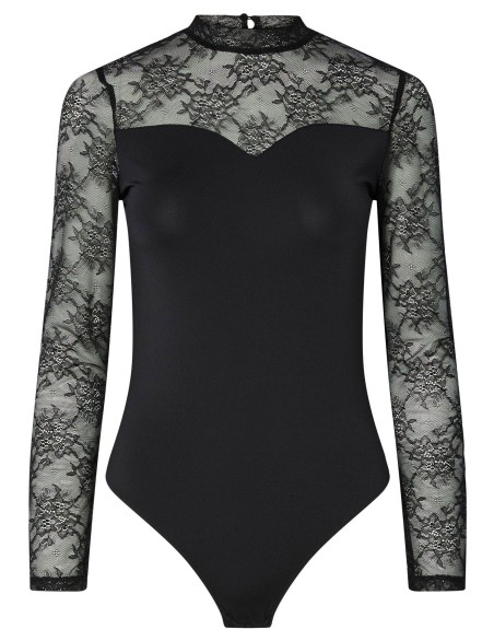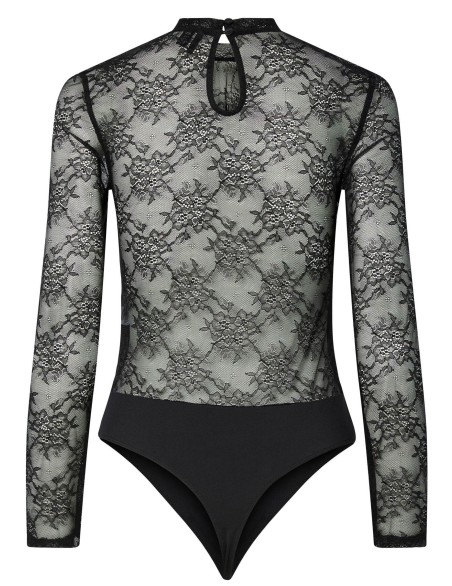 Elegante body femminile caratterizzato da maniche lunghe e dettagli sul décolleté in pizzo floreale trasparente, che creano un sofisticato contrasto con il corpetto opaco. Il design presenta un colletto e una vestibilità aderente che valorizza la silhouette. Realizzato in materiale stretch confortevole con inserti in pizzo pregiato, chiusura a gancetto sul retro e taglio a sgambato per massimo comfort. Capo versatile perfetto sia come underwear raffinato che come top da indossare con jeans o pantaloni eleganti per occasioni speciali.
