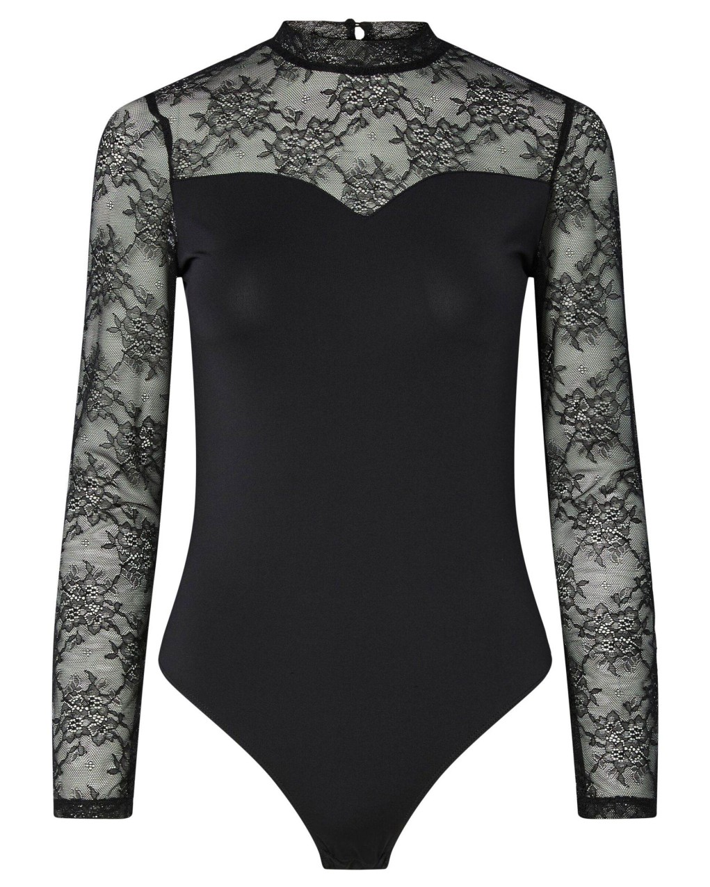 Elegante body femminile caratterizzato da maniche lunghe e dettagli sul décolleté in pizzo floreale trasparente, che creano un sofisticato contrasto con il corpetto opaco. Il design presenta un colletto e una vestibilità aderente che valorizza la silhouette. Realizzato in materiale stretch confortevole con inserti in pizzo pregiato, chiusura a gancetto sul retro e taglio a sgambato per massimo comfort. Capo versatile perfetto sia come underwear raffinato che come top da indossare con jeans o pantaloni eleganti per occasioni speciali.