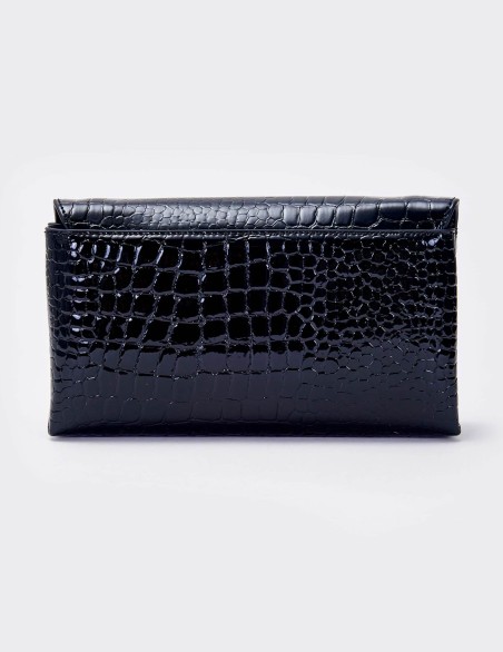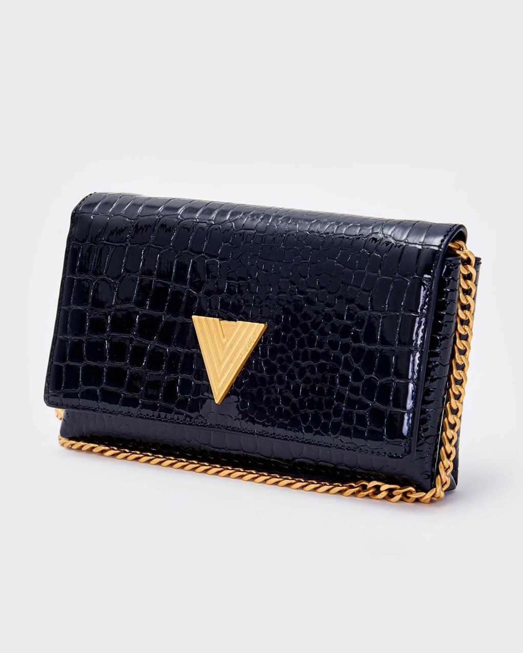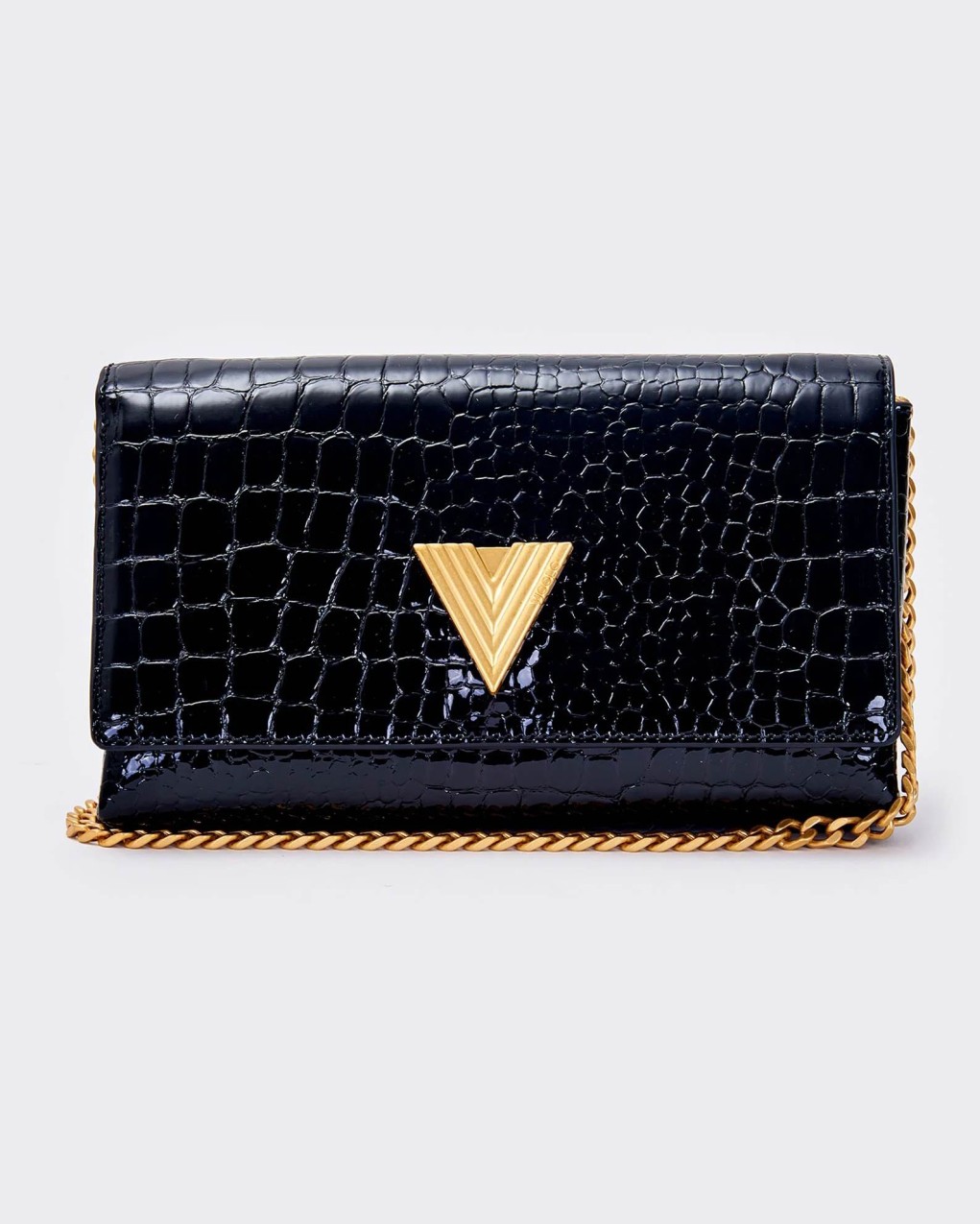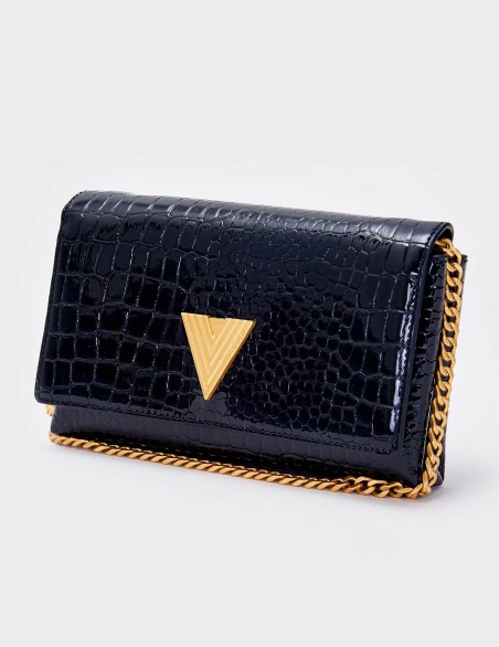 Elegante pochette in pelle con raffinata texture coccodrillo e finitura lucida. Il design è impreziosito da un distintivo logo metallico a V e una catena dorata a tracolla. La struttura compatta ma funzionale offre lo spazio ideale per gli essenziali da serata, con una chiusura a patta che garantisce sicurezza e stile.