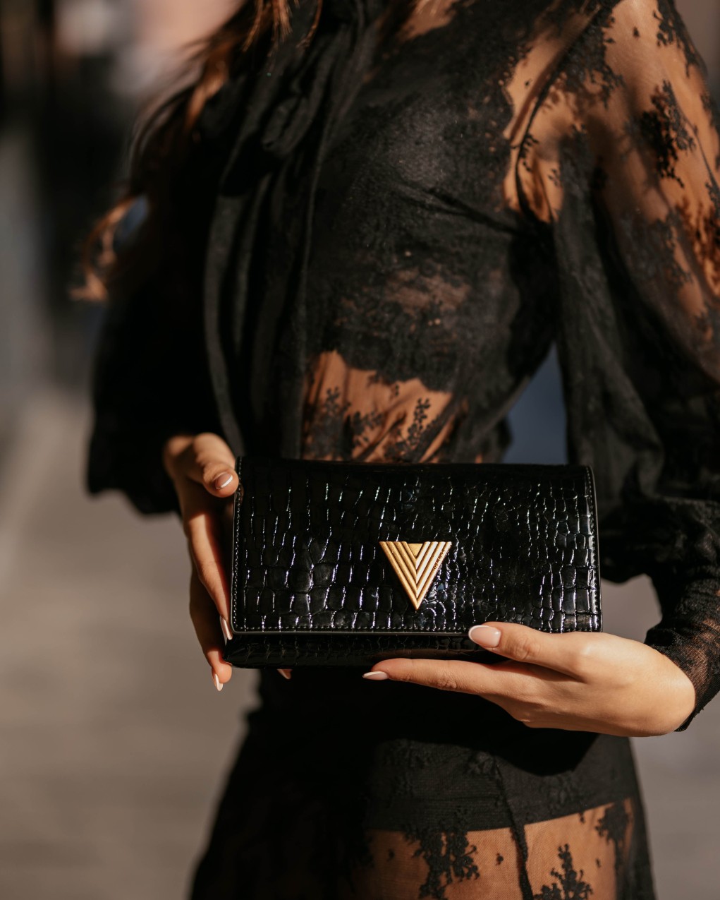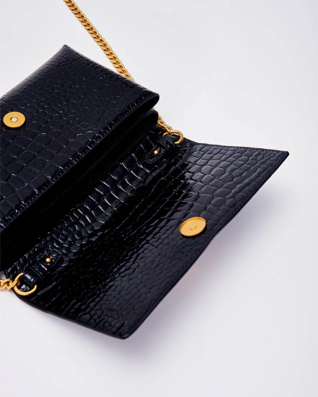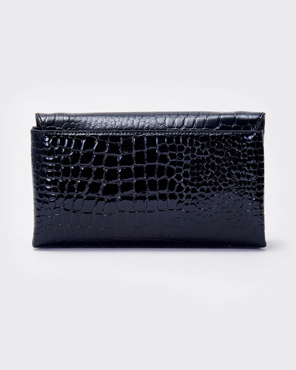 Elegante pochette in pelle con raffinata texture coccodrillo e finitura lucida. Il design è impreziosito da un distintivo logo metallico a V e una catena dorata a tracolla. La struttura compatta ma funzionale offre lo spazio ideale per gli essenziali da serata, con una chiusura a patta che garantisce sicurezza e stile.