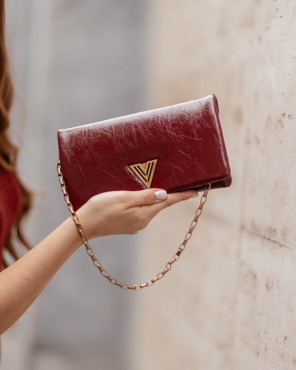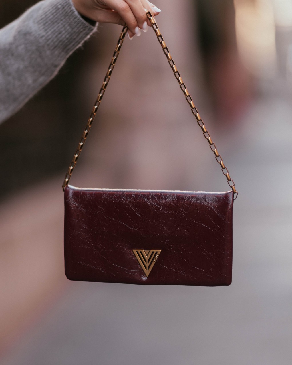 Elegante borsa a tracolla in pelle lucida con distintivo logo metallico a V sul fronte. Il design minimal è impreziosito da una catena metallica a maglie rettangolari che funge da tracolla. La forma compatta e il taglio essenziale la rendono perfetta per occasioni serali e look sofisticati.