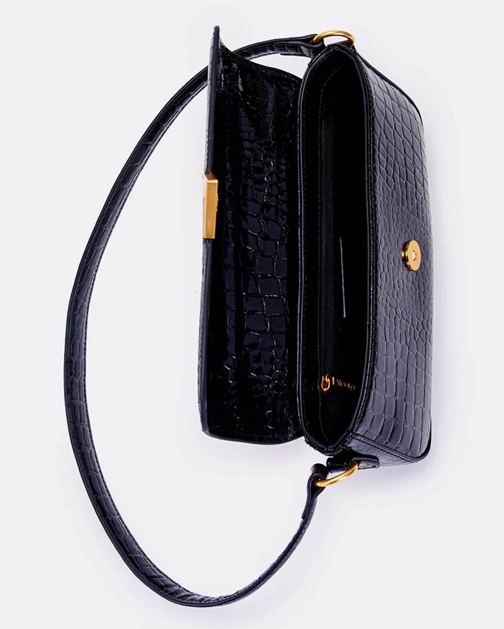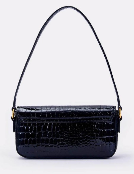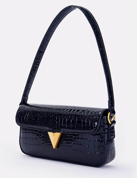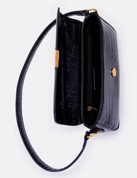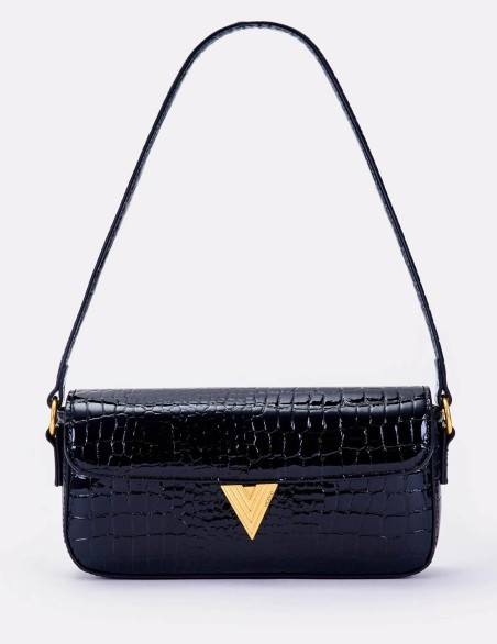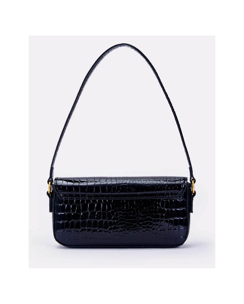 Borsa Pencil a spalla in ecopelle effetto "coco" in vernice . Tracolla in similpelle rigida. Chiusura con bottone a pressione con calamita. Dettaglio logo metal plate Vicolo. Finiture anticate color oro. Tasca interna con cerniera e taschina piatta.