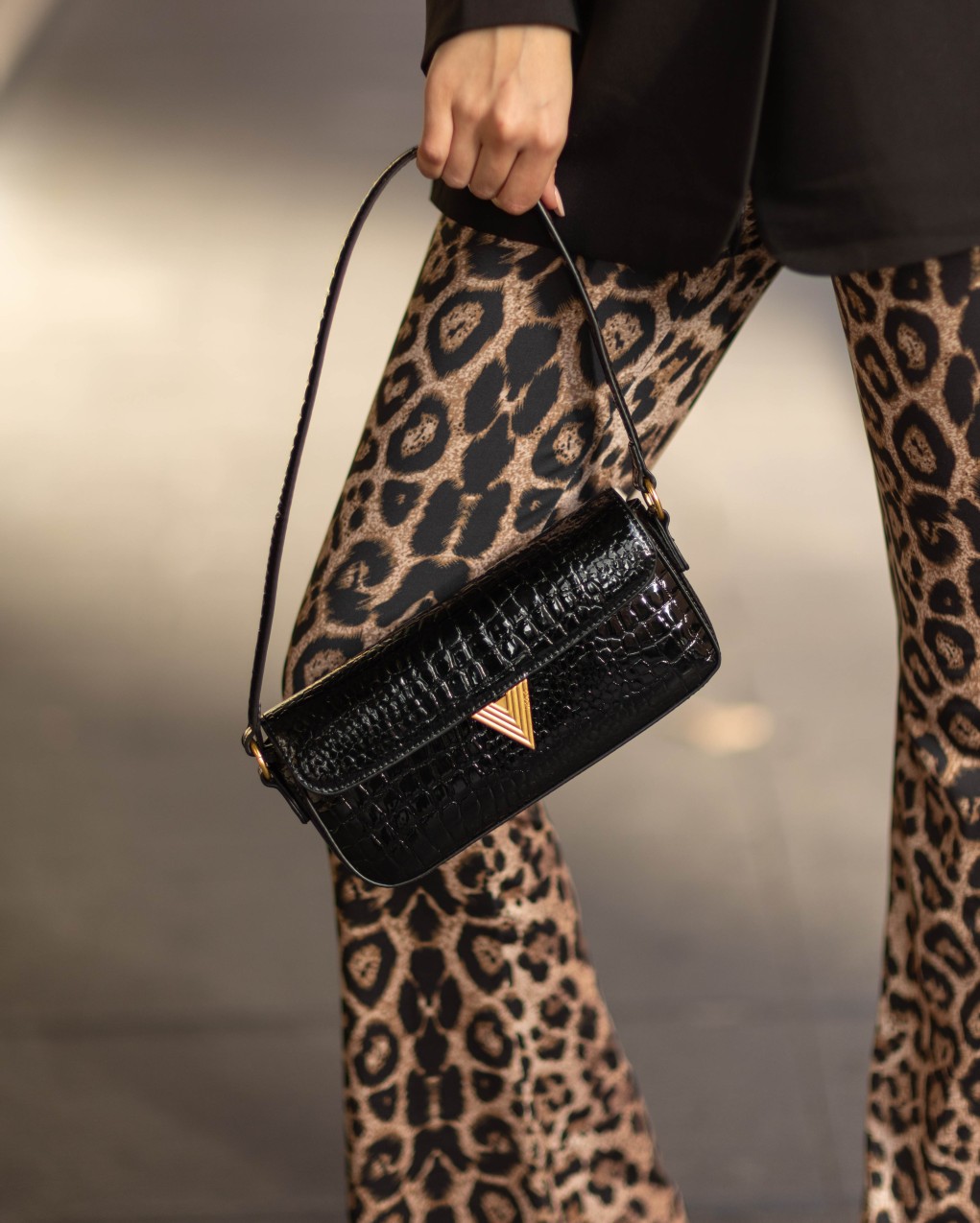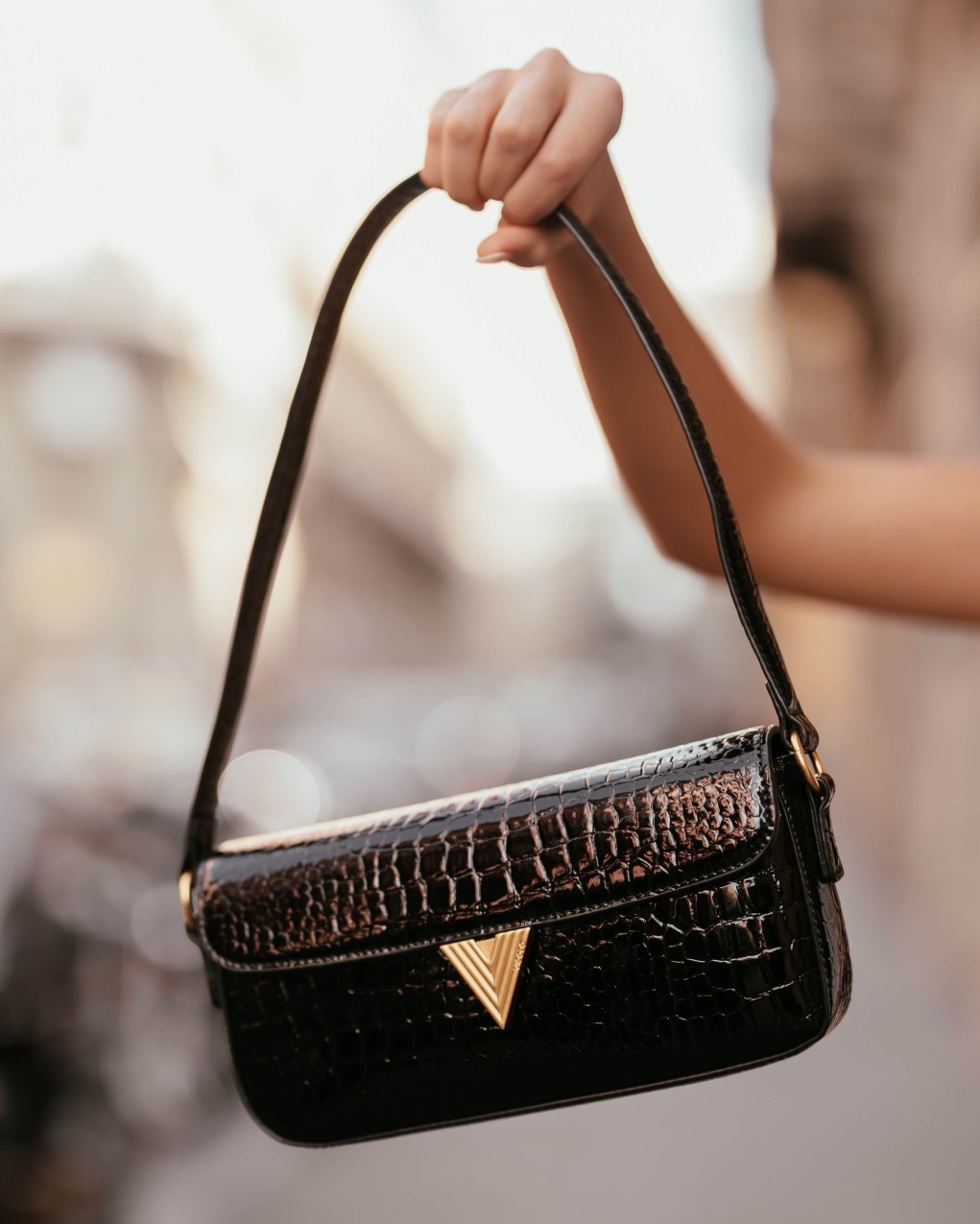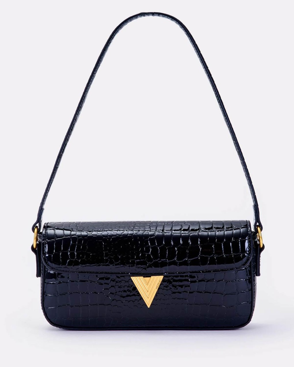 Borsa Pencil a spalla in ecopelle effetto "coco" in vernice . Tracolla in similpelle rigida. Chiusura con bottone a pressione con calamita. Dettaglio logo metal plate Vicolo. Finiture anticate color oro. Tasca interna con cerniera e taschina piatta.
