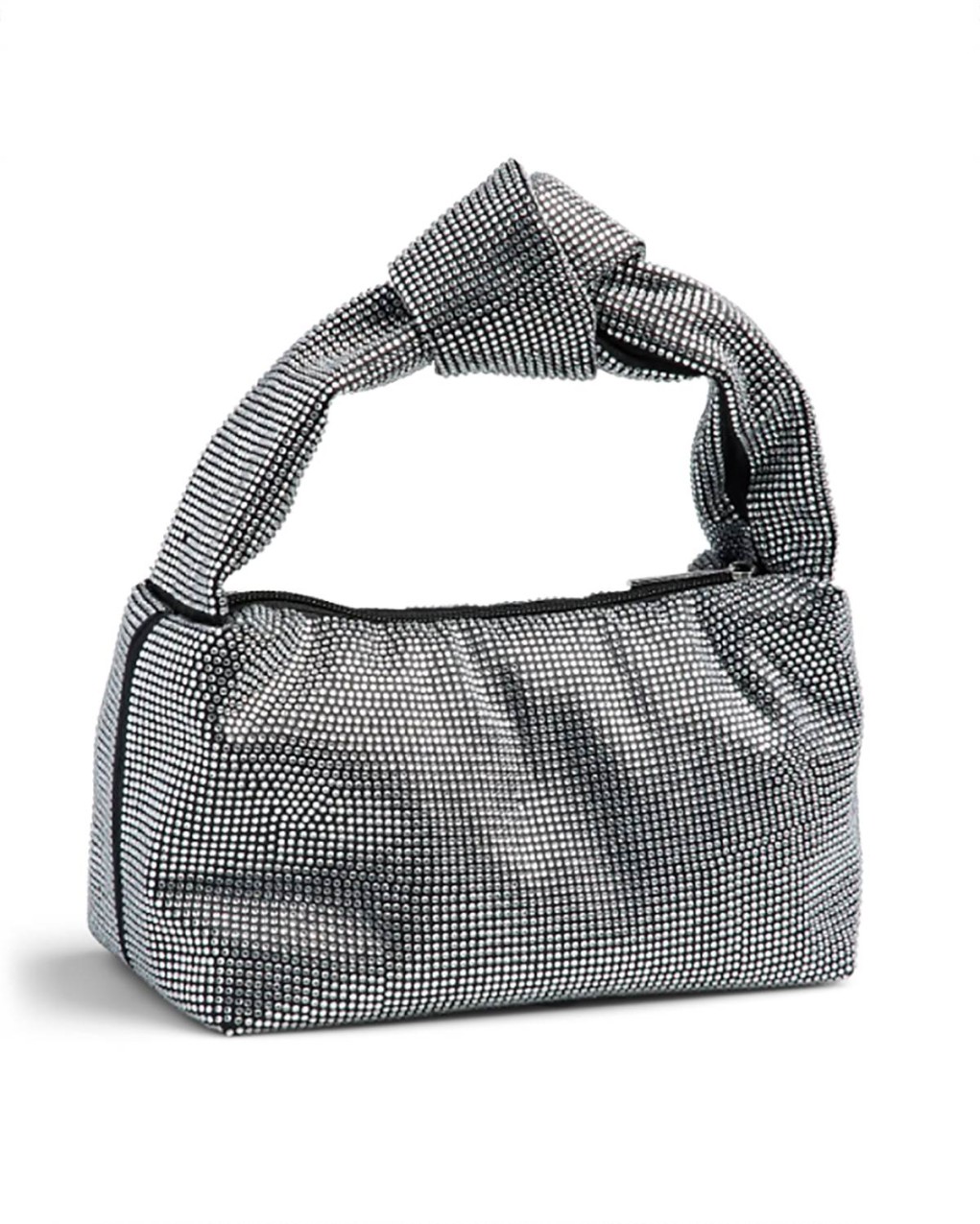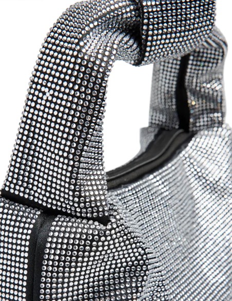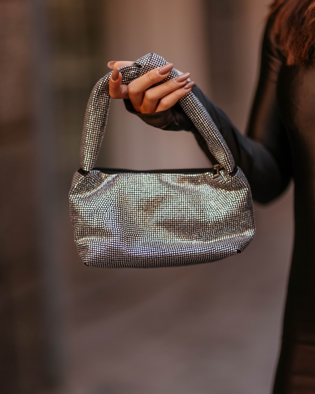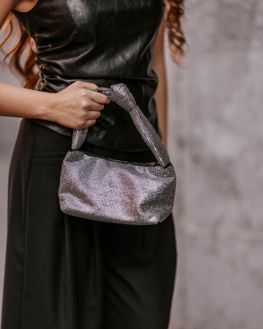 Elegante borsa hobo con texture metallica a micro-maglia, perfetta per occasioni speciali e serate glamour. Il design presenta una caratteristica chiusura con nodo superiore e una forma morbida e slouchy che conferisce un tocco contemporaneo. Realizzata in tessuto lavorato con finitura brillante, offre spazio interno funzionale ed è dotata di zip per una chiusura sicura.