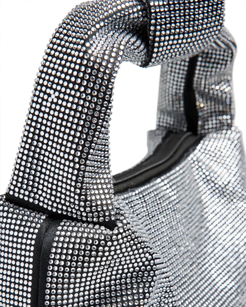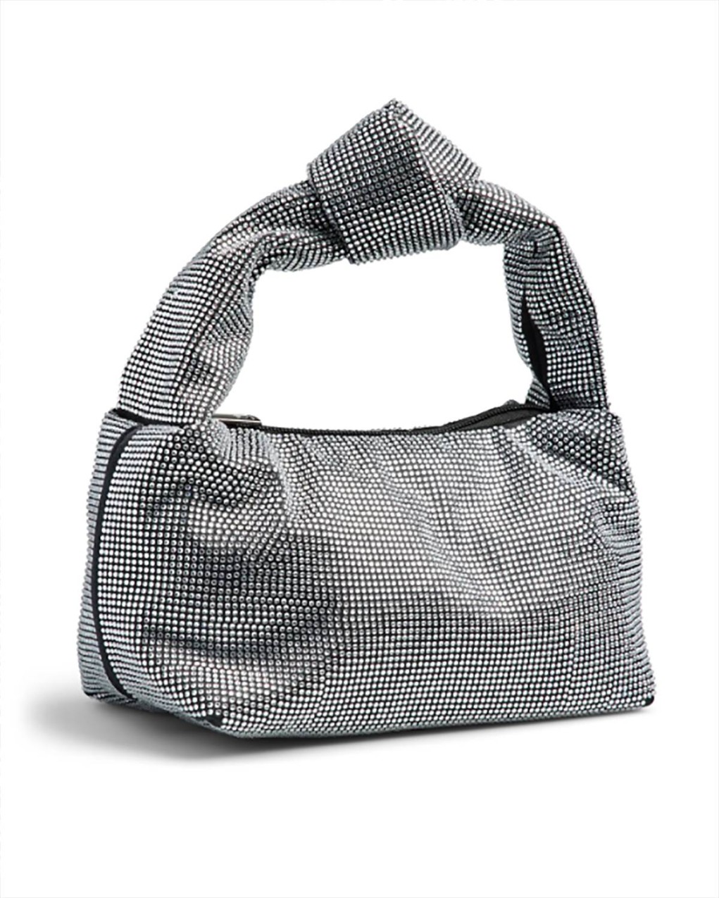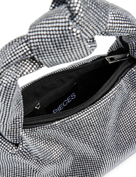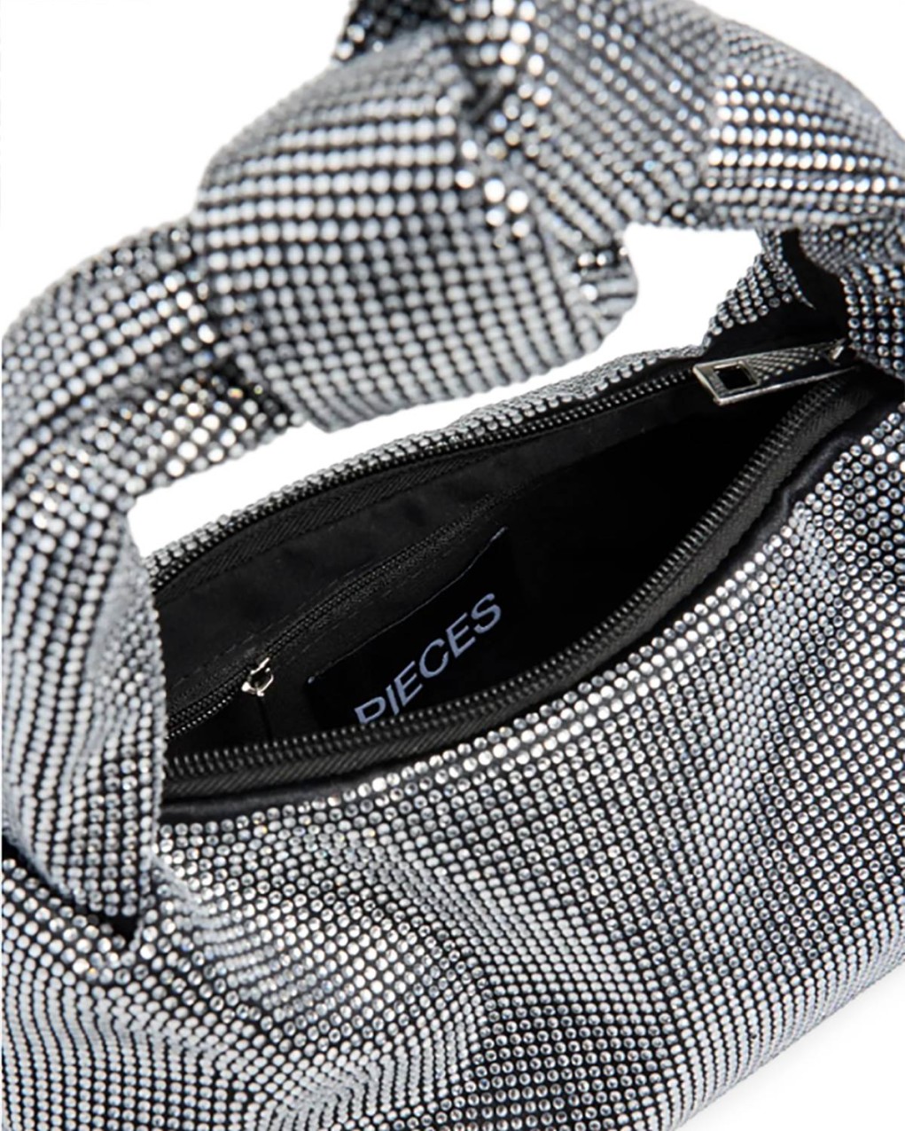 Elegante borsa hobo con texture metallica a micro-maglia, perfetta per occasioni speciali e serate glamour. Il design presenta una caratteristica chiusura con nodo superiore e una forma morbida e slouchy che conferisce un tocco contemporaneo. Realizzata in tessuto lavorato con finitura brillante, offre spazio interno funzionale ed è dotata di zip per una chiusura sicura.