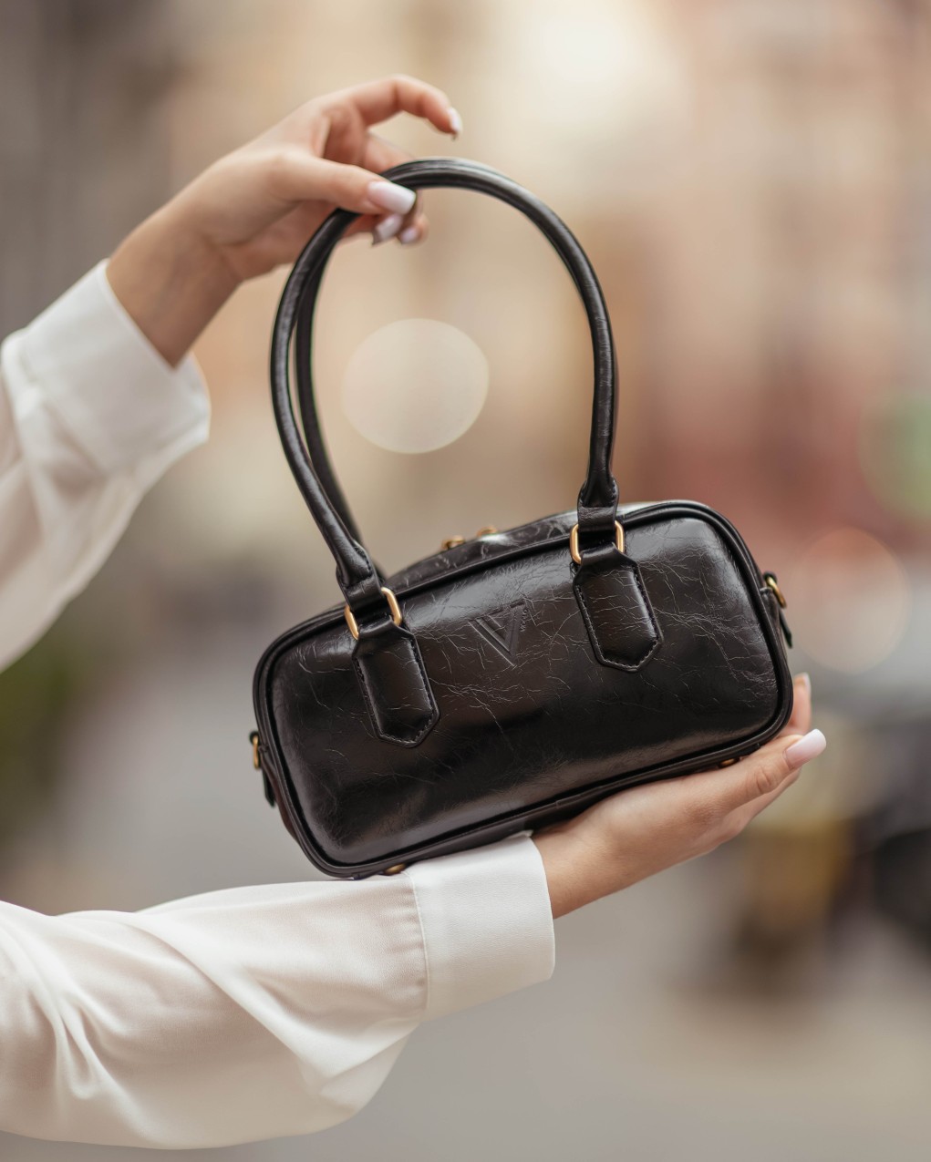Borsa a mano compatta in pelle sintetica effetto vintage, dal design elegante e versatile. Dotata di doppi manici strutturati e tracolla removibile regolabile per un utilizzo crossbody. Le finiture in metallo dorato e i dettagli decorativi sul frontale aggiungono un tocco raffinato. Dimensioni compatte ideali per l'essenziale quotidiano, perfetta per completare outfit casual o formali.