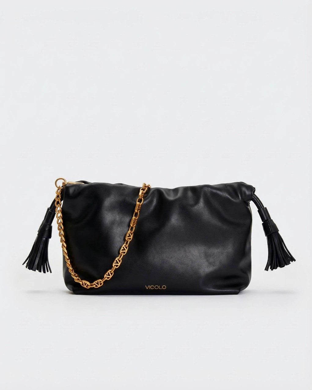 Borsa Tassel Small in ecopelle a spalla. Dettaglio rouches sul bordo. Chiusura con bottoni a pressione con calamita e coulisse in ecopelle con nappine. Dettaglio tracolla catena V metal plate Vicolo removibile. Tasca interna con cerniera e taschina piatta. Dettagli in metallo color oro.