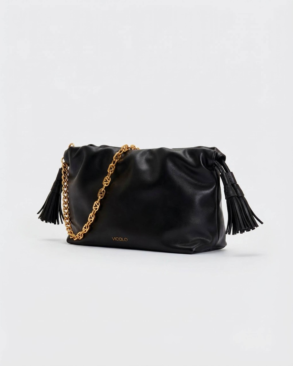 Borsa Tassel Small in ecopelle a spalla. Dettaglio rouches sul bordo. Chiusura con bottoni a pressione con calamita e coulisse in ecopelle con nappine. Dettaglio tracolla catena V metal plate Vicolo removibile. Tasca interna con cerniera e taschina piatta. Dettagli in metallo color oro.