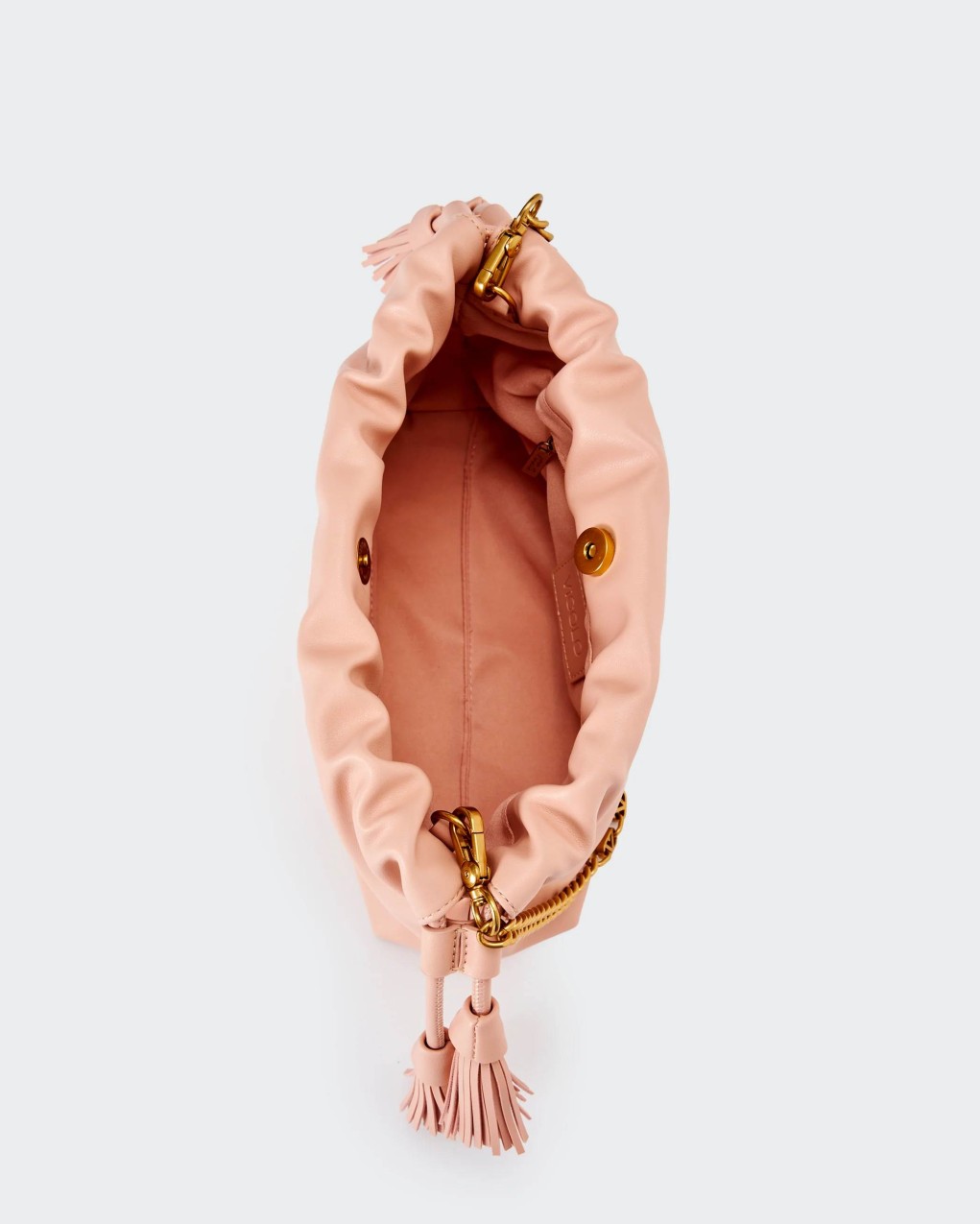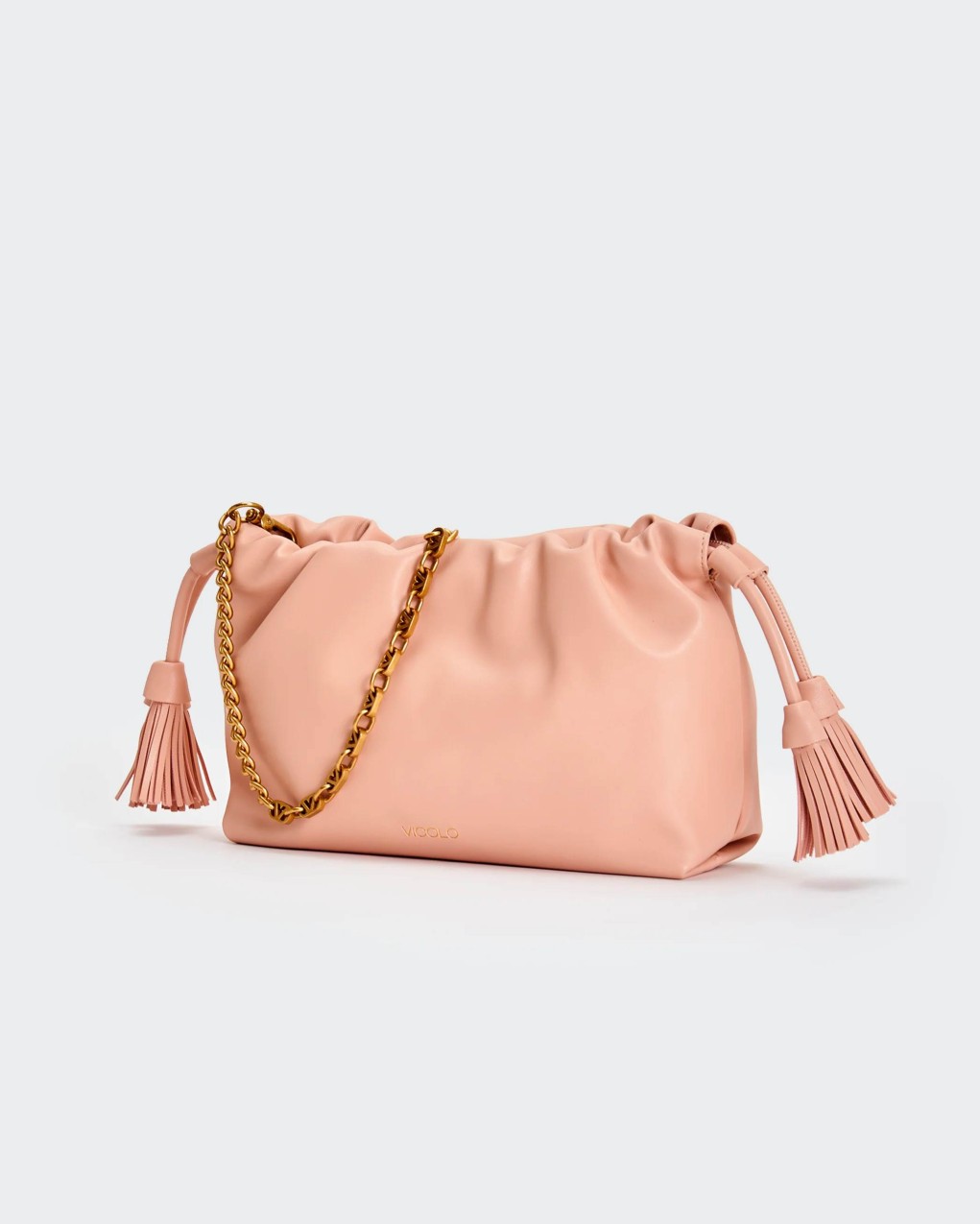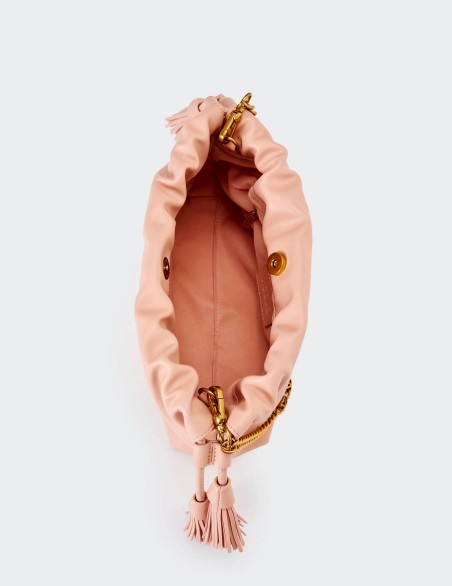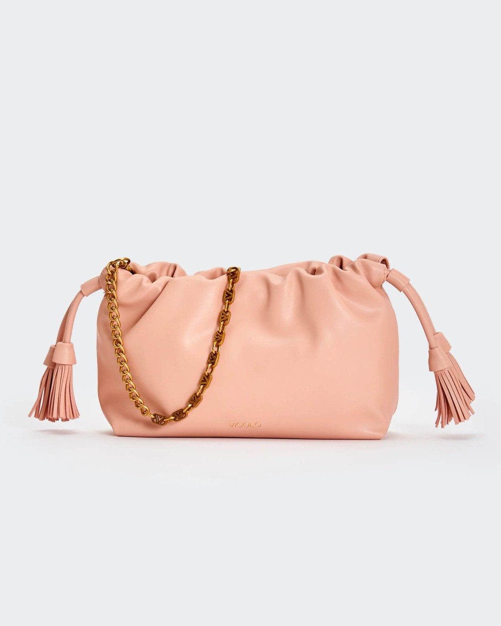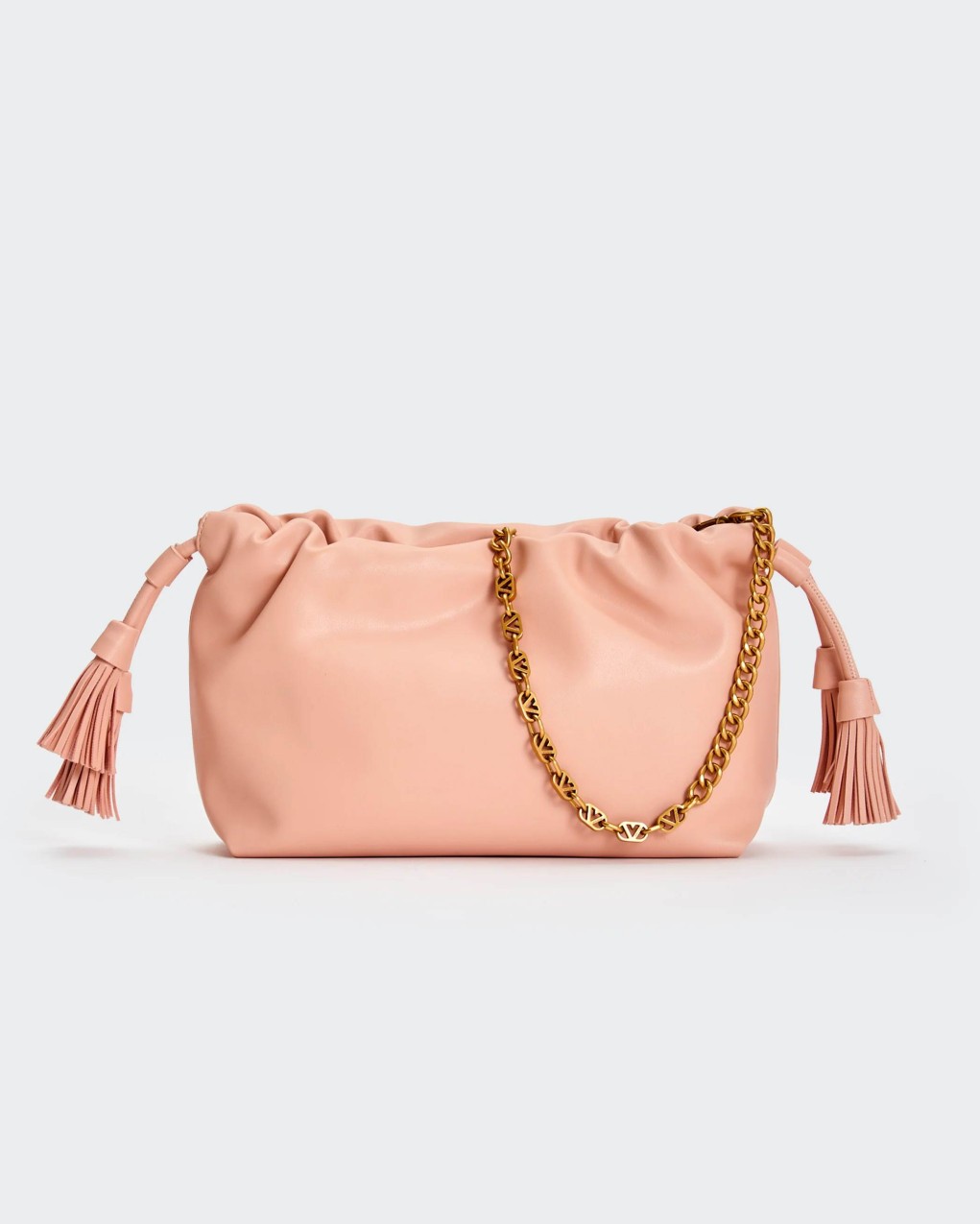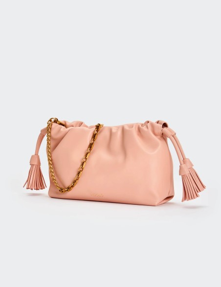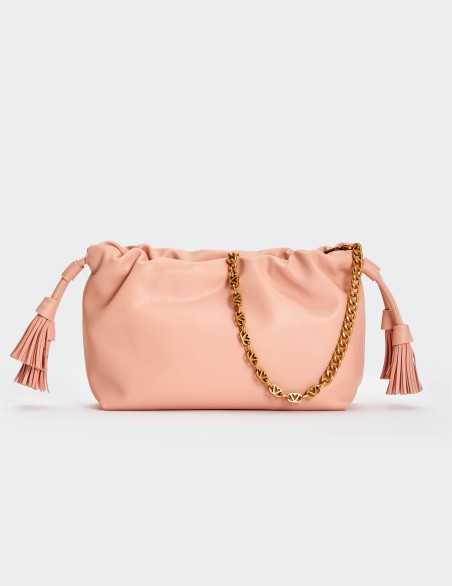 Borsa Tassel Small in ecopelle a spalla. Dettaglio rouches sul bordo. Chiusura con bottoni a pressione con calamita e coulisse in ecopelle con nappine. Dettaglio tracolla catena V metal plate Vicolo removibile. Tasca interna con cerniera e taschina piatta. Dettagli in metallo color oro.