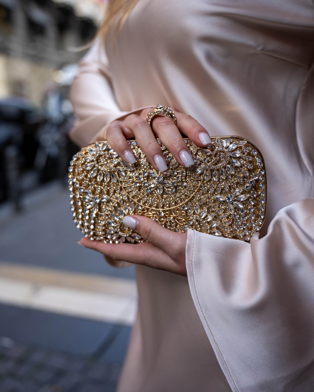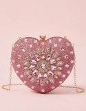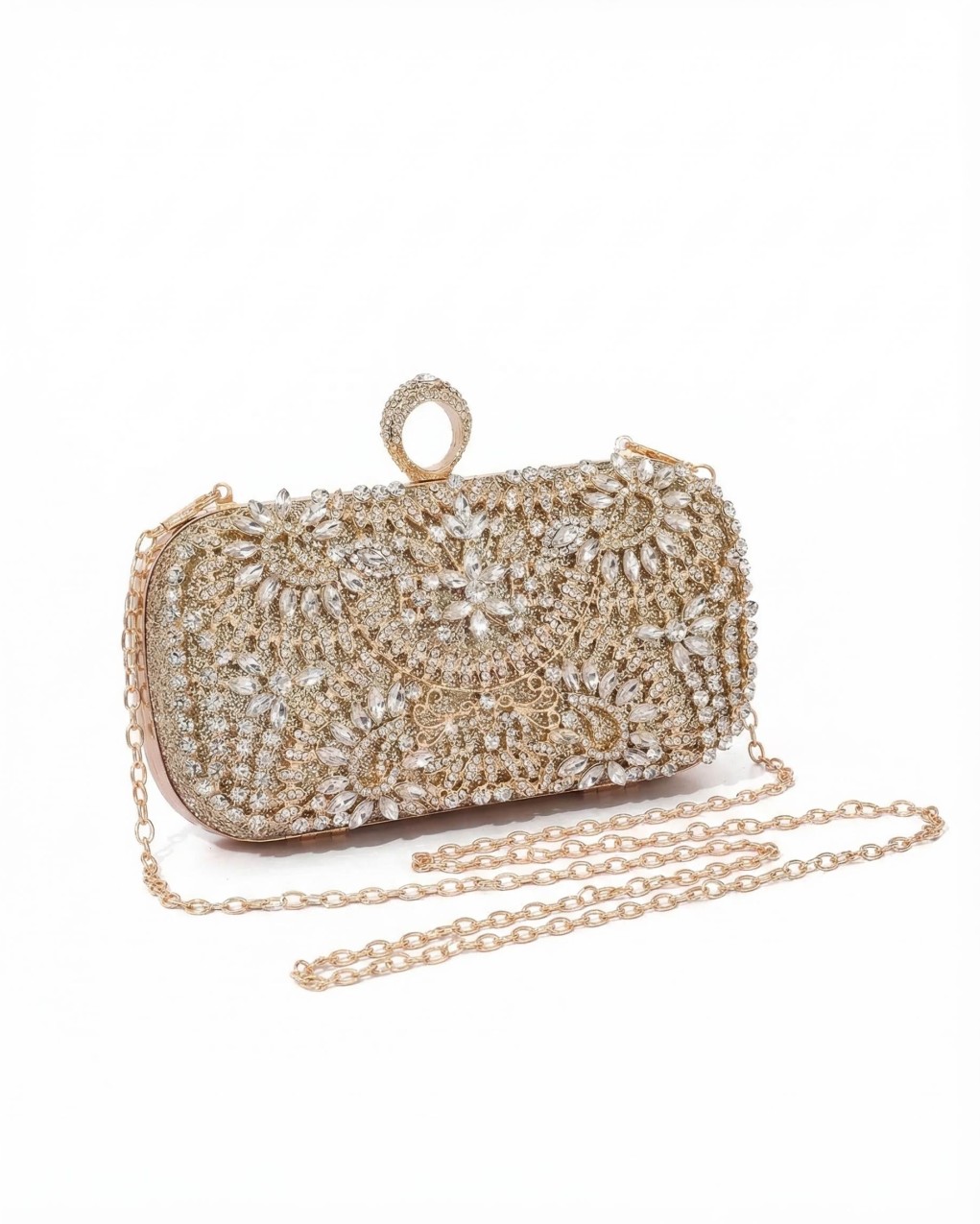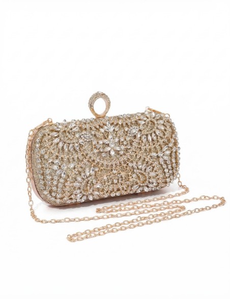 Clutch rigida da sera con chiusura a clip, impreziosita da eleganti applicazioni in cristalli e strass che ricoprono interamente la superficie. La struttura rigida offre protezione ottimale per gli oggetti essenziali, mentre le dimensioni compatte la rendono perfetta da portare a mano o con la tracolla removibile inclusa. Accessorio dal design glamour ideale per cerimonie, eventi formali e occasioni speciali, dove lo stile ricercato fa la differenza.