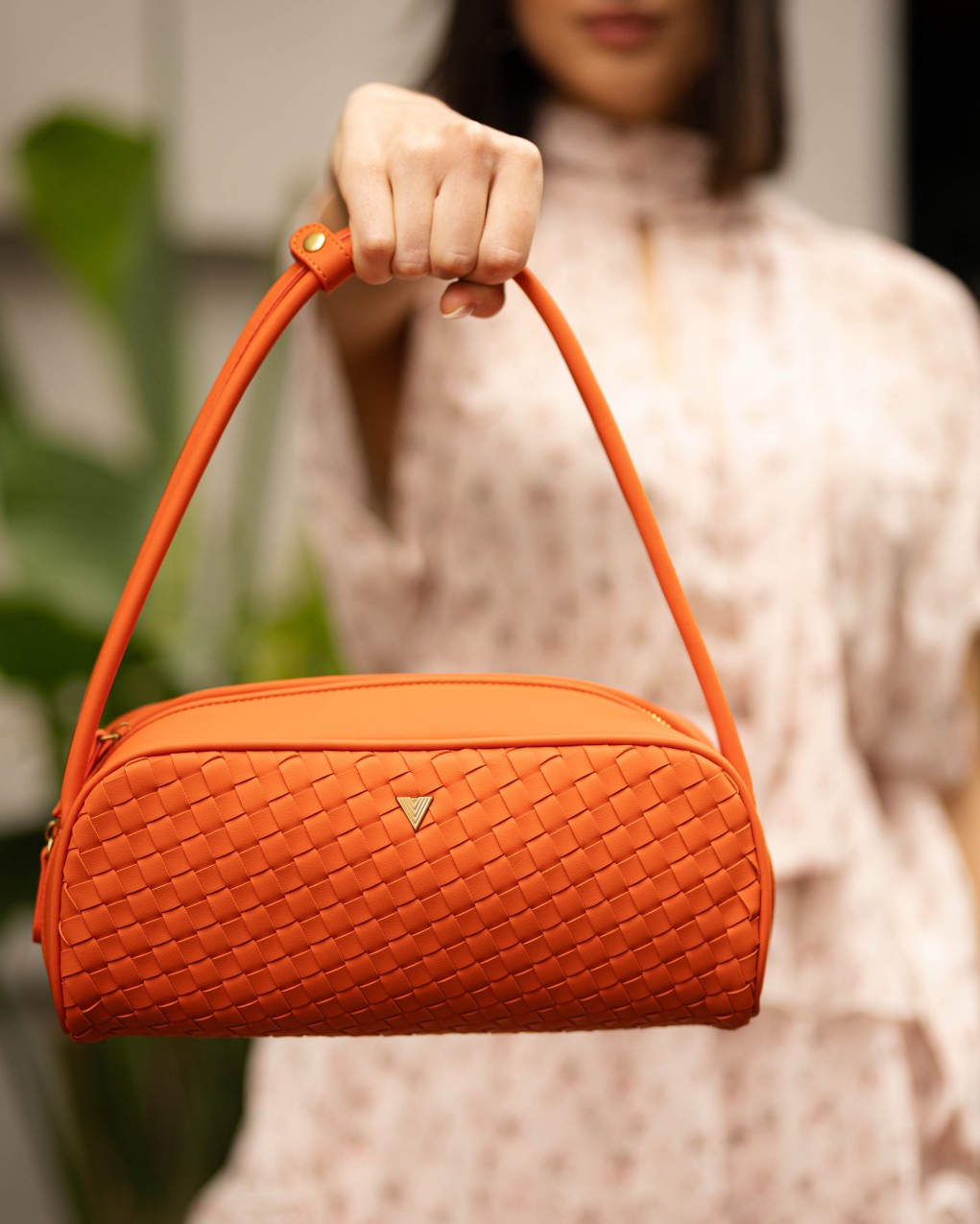 Borsa Hicari a spalla in ecopelle intrecciata. Chiusura con zip di metallo con tiralampo in ecopelle. Manici rigidi in ecopelle liscia con fascetta con bottoncino a clip. Dettaglio fibbia V metal plate Vicolo. Dettaglio finiture anticate color oro. Tasca interna con cerniera e taschina piatta.