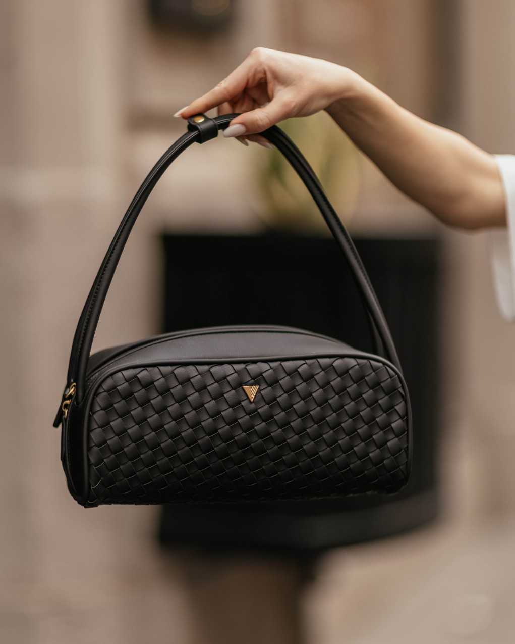 Borsa Hicari a spalla in ecopelle intrecciata. Chiusura con zip di metallo con tiralampo in ecopelle. Manici rigidi in ecopelle liscia con fascetta con bottoncino a clip. Dettaglio fibbia V metal plate Vicolo. Dettaglio finiture anticate color oro. Tasca interna con cerniera e taschina piatta.