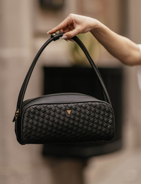 Borsa Hicari a spalla in ecopelle intrecciata. Chiusura con zip di metallo con tiralampo in ecopelle. Manici rigidi in ecopelle liscia con fascetta con bottoncino a clip. Dettaglio fibbia V metal plate Vicolo. Dettaglio finiture anticate color oro. Tasca interna con cerniera e taschina piatta.