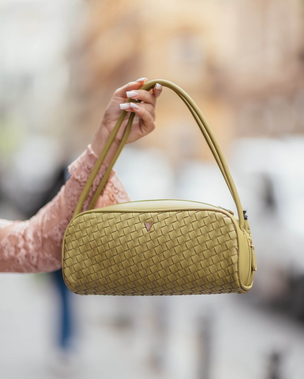 Borsa Hicari a spalla in ecopelle intrecciata. Chiusura con zip di metallo con tiralampo in ecopelle. Manici rigidi in ecopelle liscia con fascetta con bottoncino a clip. Dettaglio fibbia V metal plate Vicolo. Dettaglio finiture anticate color oro. Tasca interna con cerniera e taschina piatta.