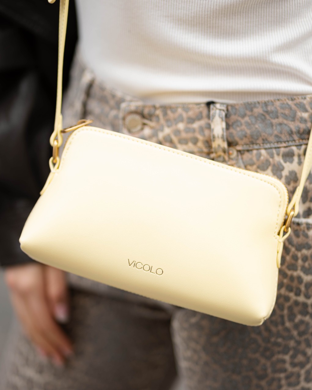Borsa a tracolla compatta Vicolo dallo stile minimalista e contemporaneo. Realizzata in ecopelle di alta qualità con finitura liscia, presenta una chiusura con zip superiore e tracolla regolabile con dettagli in metallo dorato. Il design essenziale e la dimensione pratica la rendono perfetta per l'uso quotidiano, offrendo spazio sufficiente per gli oggetti essenziali. Modello versatile che si adatta a outfit casual ed eleganti.